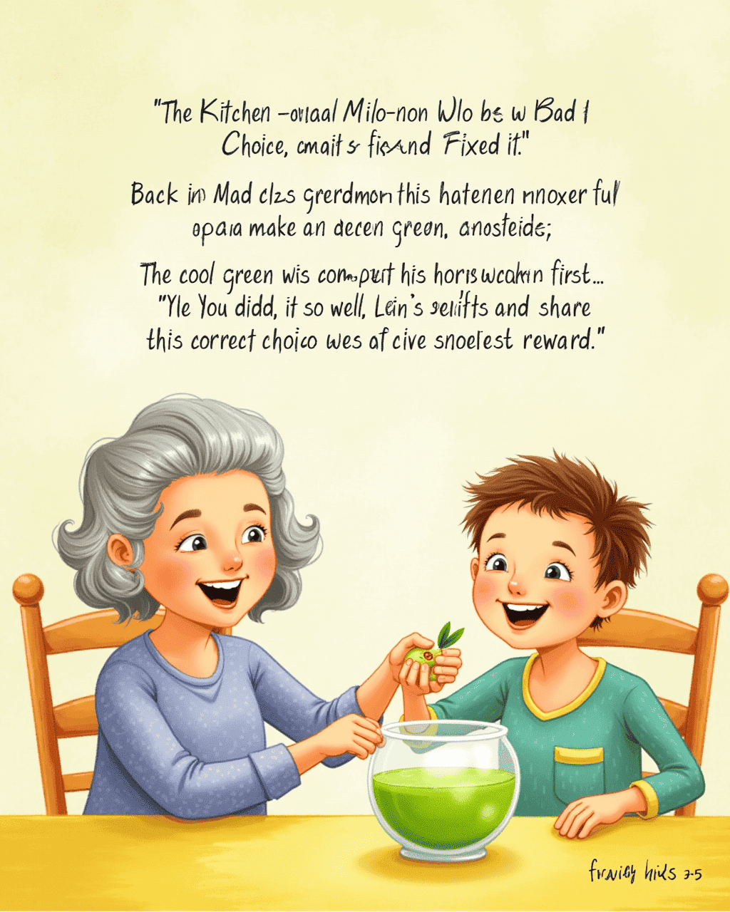 Back in the kitchen, Milo and his grandma mixed the diced apples into a bright green smoothie. The cool liquid was full of vitamins, and Milo felt proud for completing his homework first. Grandma laughed and said, "You did it so well. Let’s share this delicious snack." Milo learned that taking the correct choice was the sweetest reward.