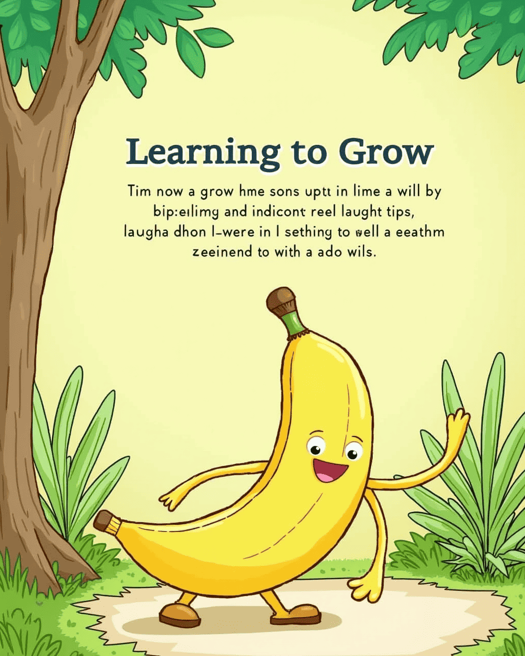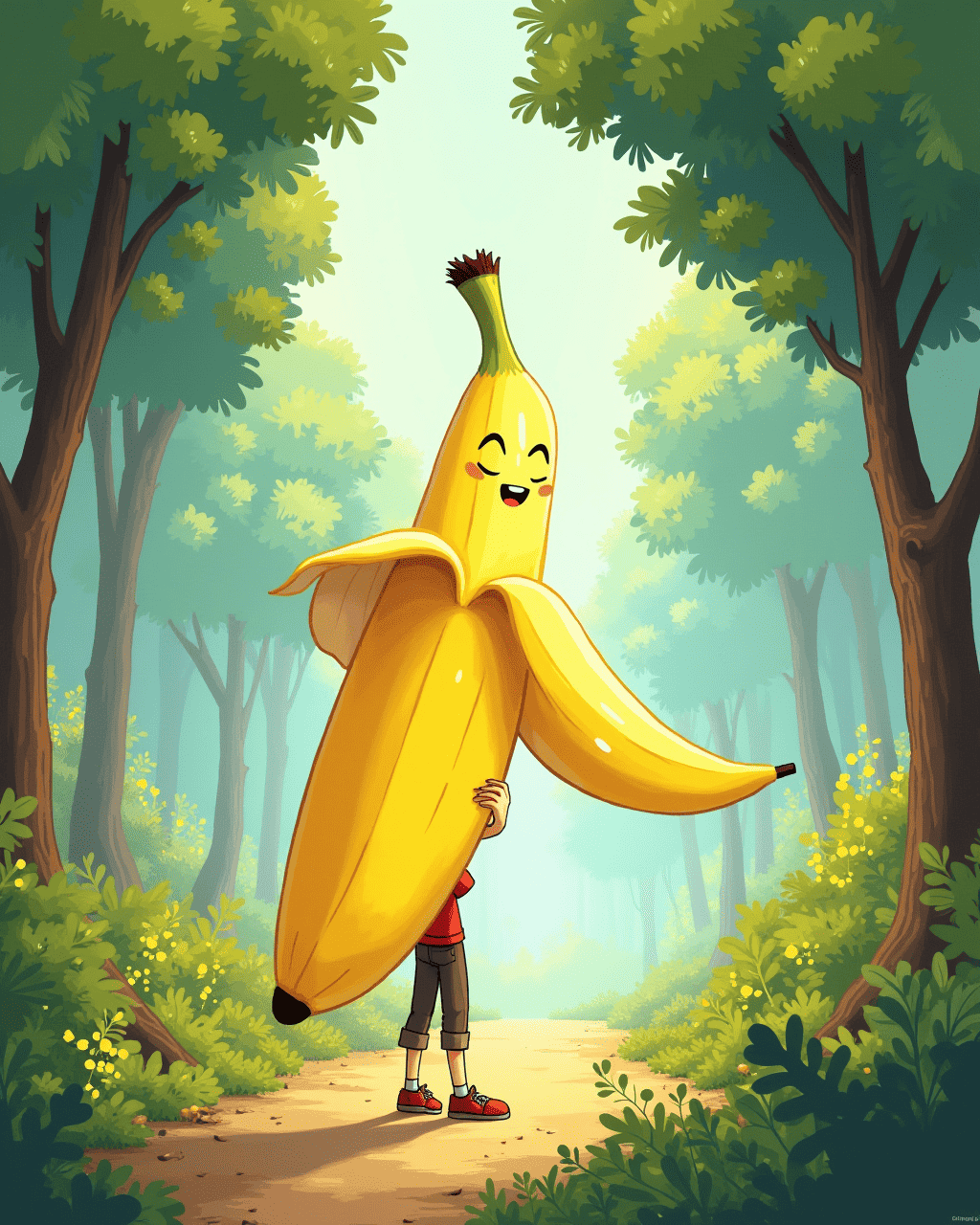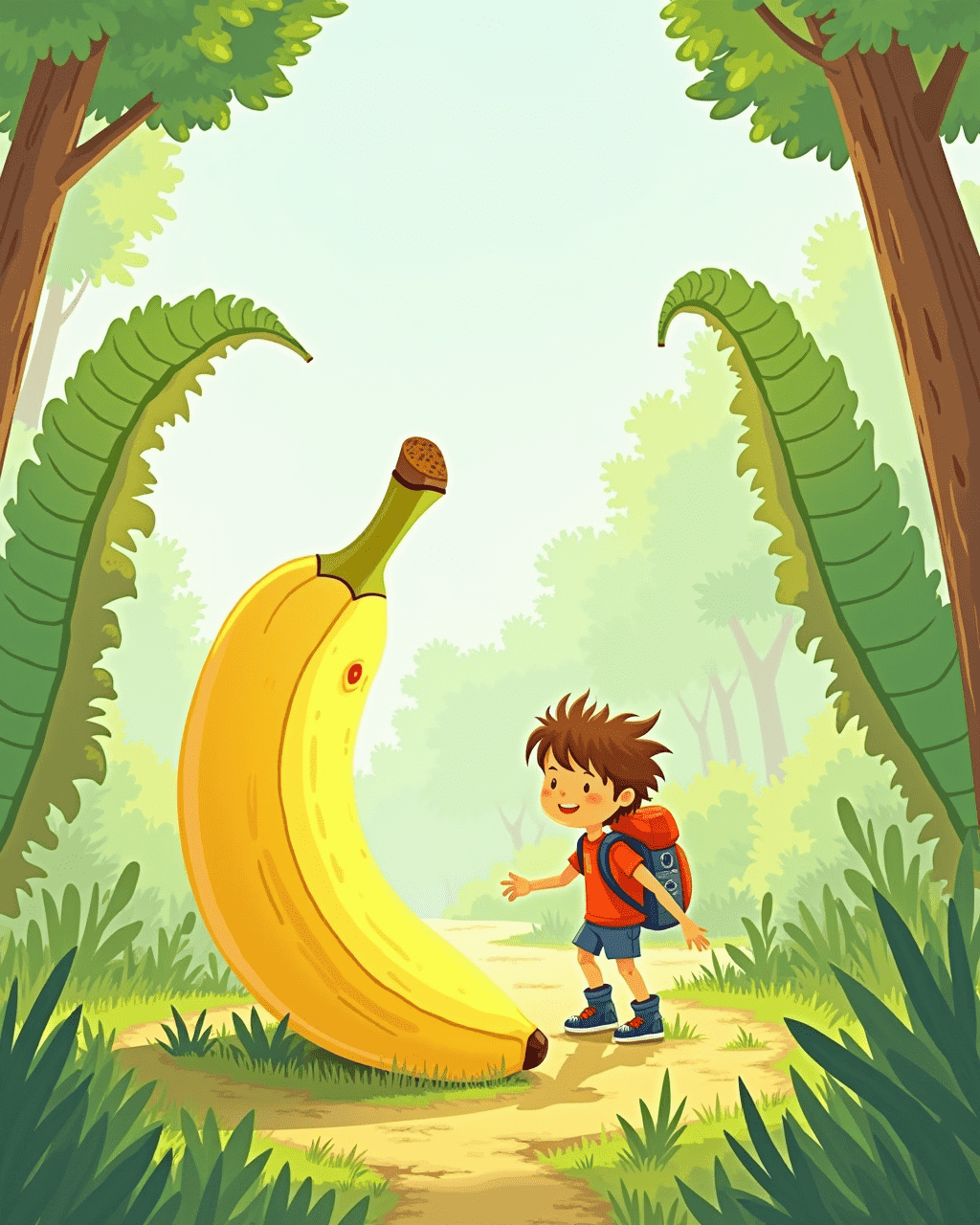 Tim, now a banana, tried to walk by twisting his new body. He bumped against a wall and laughed with a soft peel sound. The other bananas in the jungle watched and offered tips. Tim learned how to stretch, roll, and slide on the forest floor. He also learned to keep a tidy peel, a lesson from his new banana friends. Tim started enjoying being a helpful fruit.