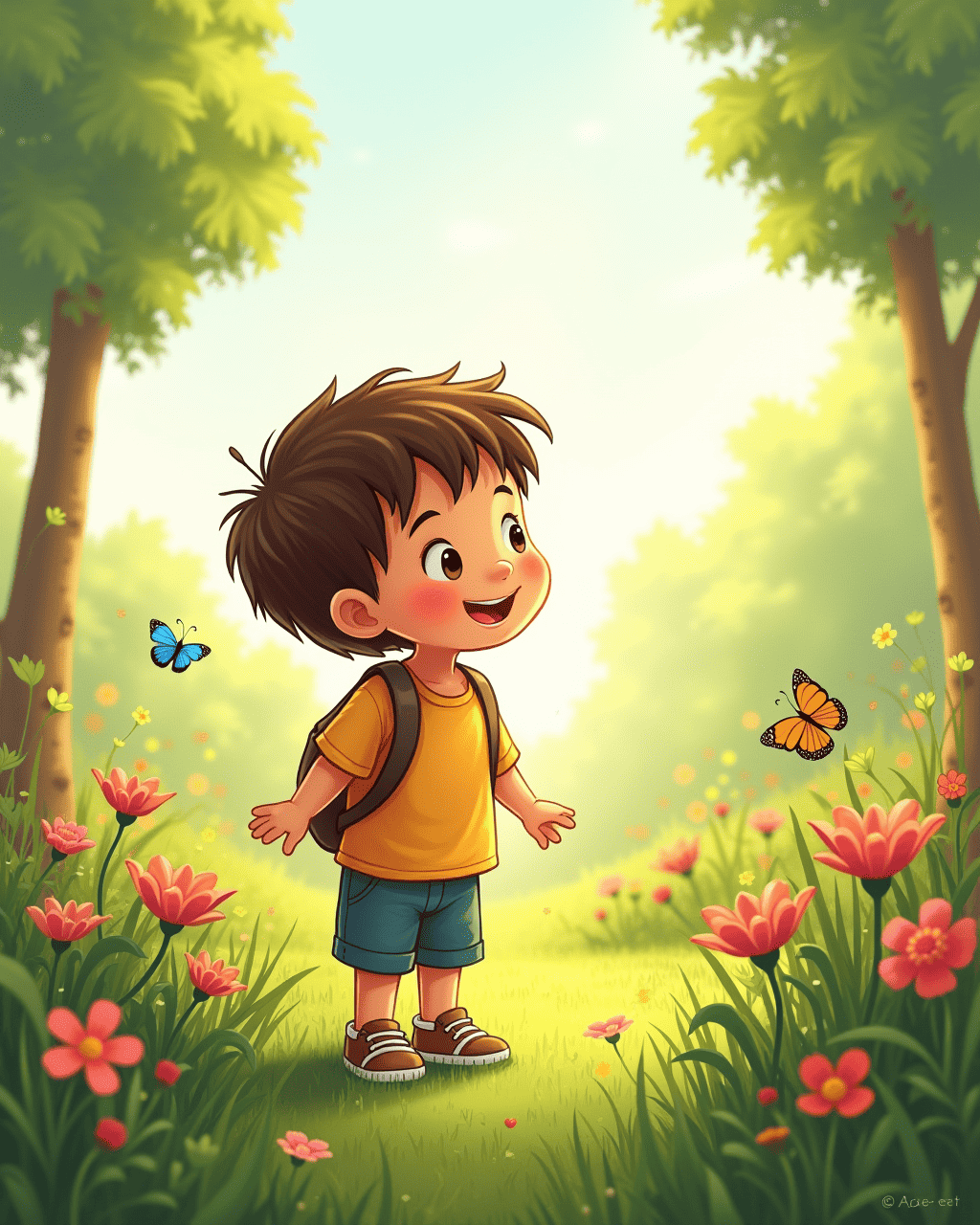 Little Milo loved to ask questions. He would wander through the garden, looking at butterflies and listening to the wind. Milo felt the grass tickle his toes. He thought that the world was a big playground. Every day was a new chance to learn something new.
