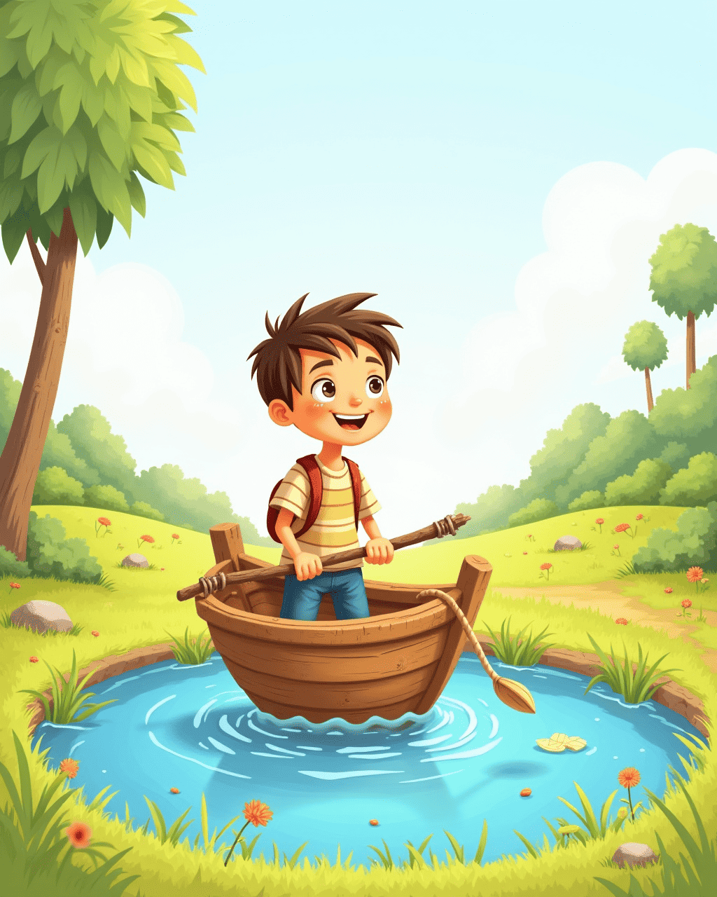 One sunny morning, Milo decided to build a small boat. He gathered twigs, leaves, and a rubber band. He stacked them carefully. Then he pushed the boat into the shallow pond. Milo watched it wobble and giggle.