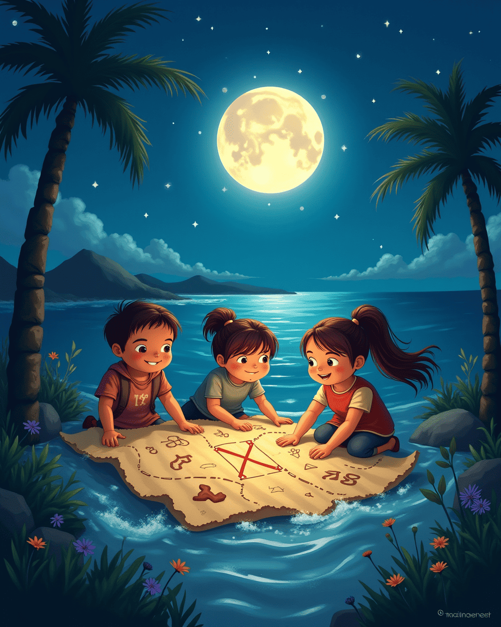 In the attic of Maya’s grandmother, she found a crinkled parchment that looked like a treasure map. The map was covered with strange symbols and a big X marked on a distant island. Maya gathered her friends Ethan, Lily, and Sam to show them the map. Everyone was excited to follow the clues to a legendary shipwreck. They decided to set sail the next full moon.