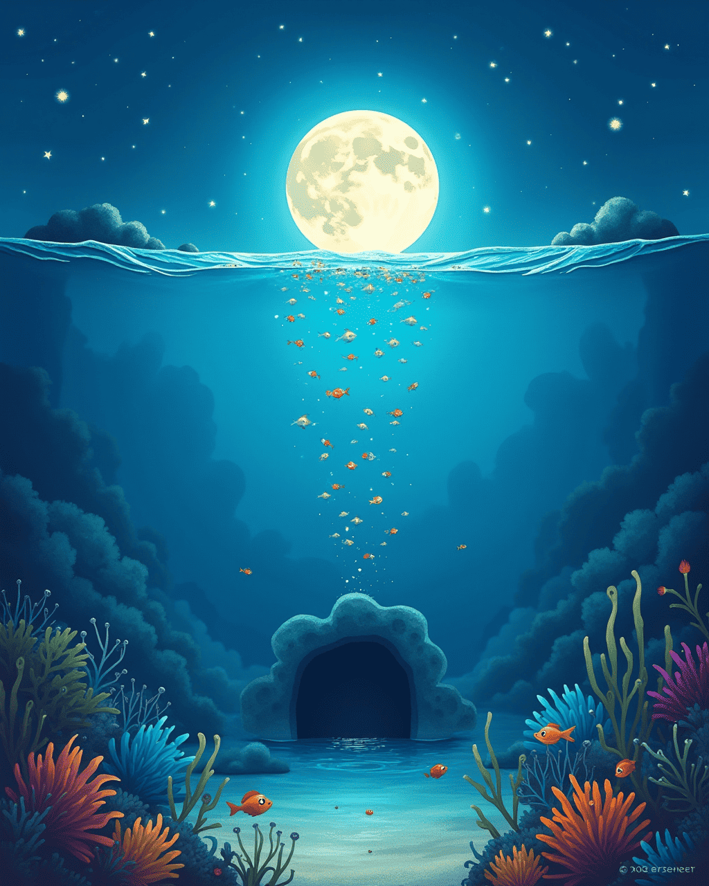 They dove into the deep blue, feeling the cool water squeeze around their shoulders. The water was filled with schools of colorful fish that darted by. The map’s clues led them to a shallow reef with a strange rock formation. Hidden beneath it was a dark opening that glimmered faintly. They prepared to see what lay inside, holding their breath.