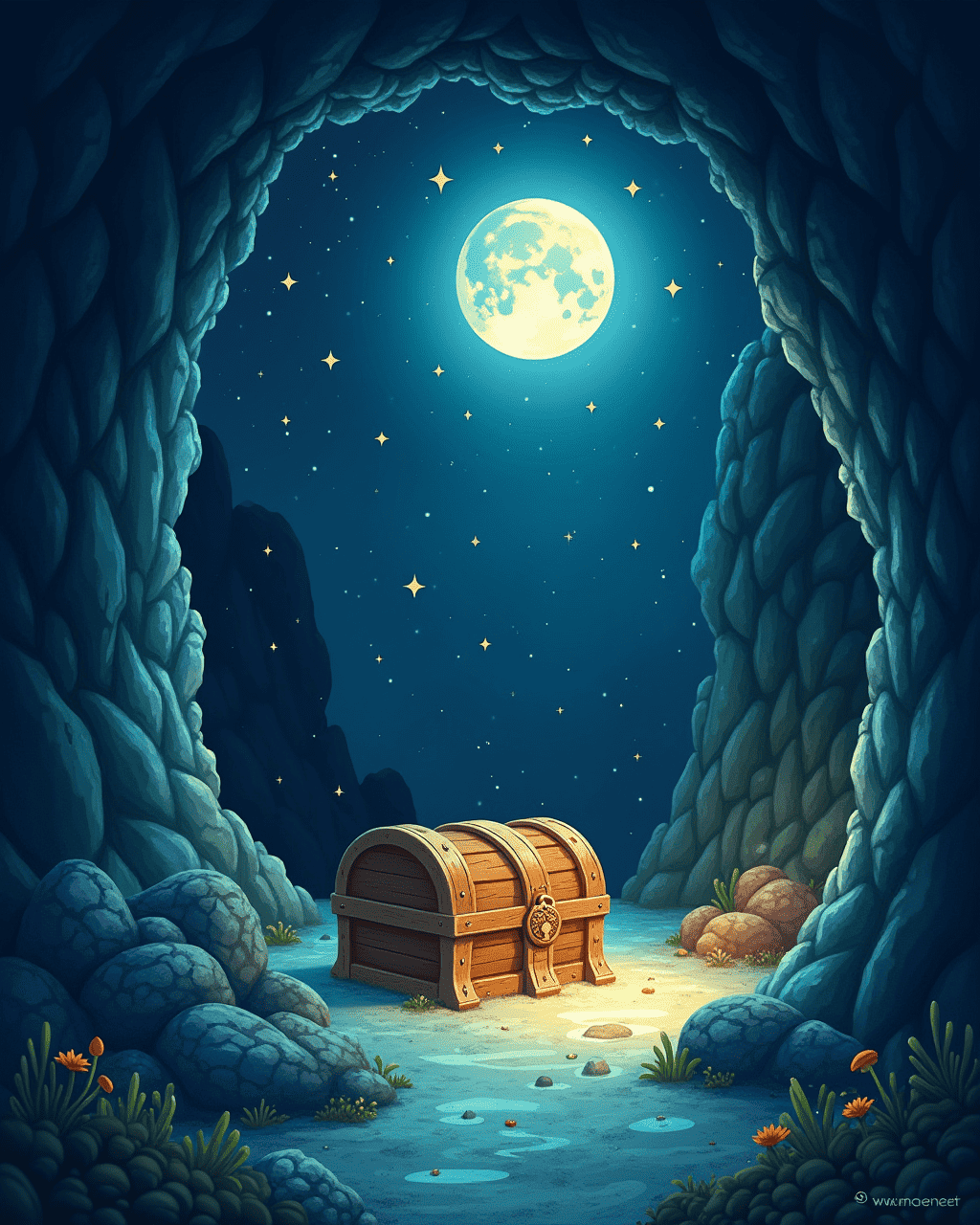 Inside the cavern, shining crystals reflected light on the walls. The kids followed a path of old barnacles and seaweed. Suddenly they discovered a rusted iron door that seemed to press against something heavy. It creaked open, revealing a dark chamber filled with dust. In the middle stood a massive wooden chest with a carved lock.