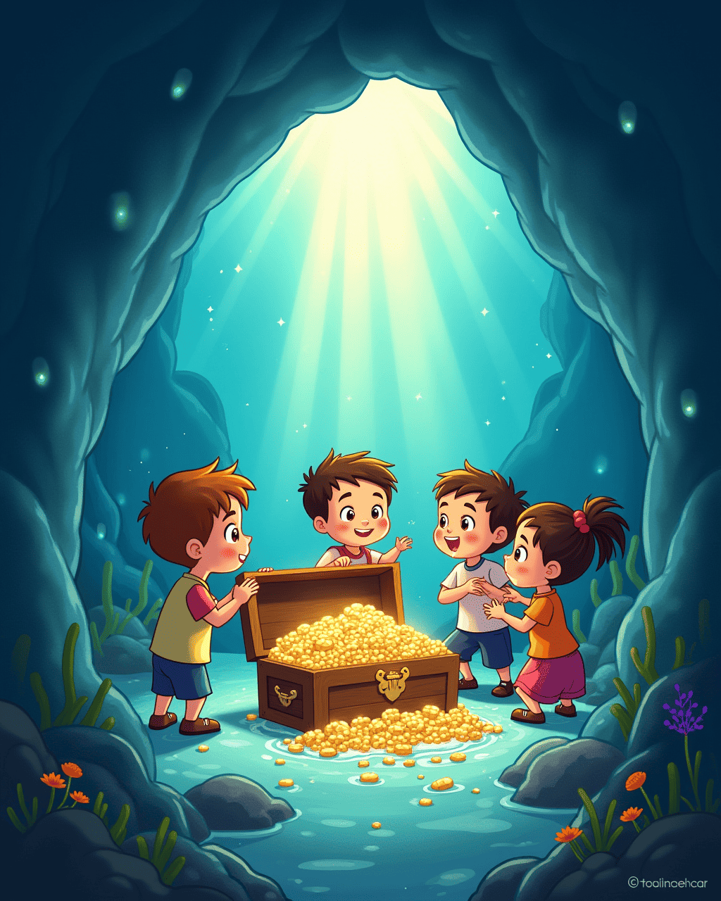 They lifted the chest together, and a bright light flooded the cavern. The treasure inside was more precious than they imagined. With the help of Captain Finn, they planned to sail back to the shore safely. The kids promised to protect the ancient treasure and share the story with future generations. The adventure ended, but the memory of the shipwreck would live on forever.