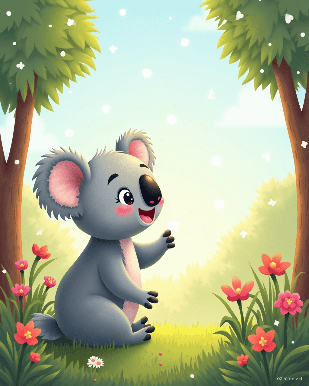 Kiki, the curious koala, lives in a sunny eucalyptus forest. One bright morning, she wakes up to hear a soft, muffled sound outside. She steps outside and sees tiny white flakes dancing in the air. The flakes feel cool and magical as they float down on her fluffy ears. Kiki’s heart jumps with excitement because she has never seen snow before.
