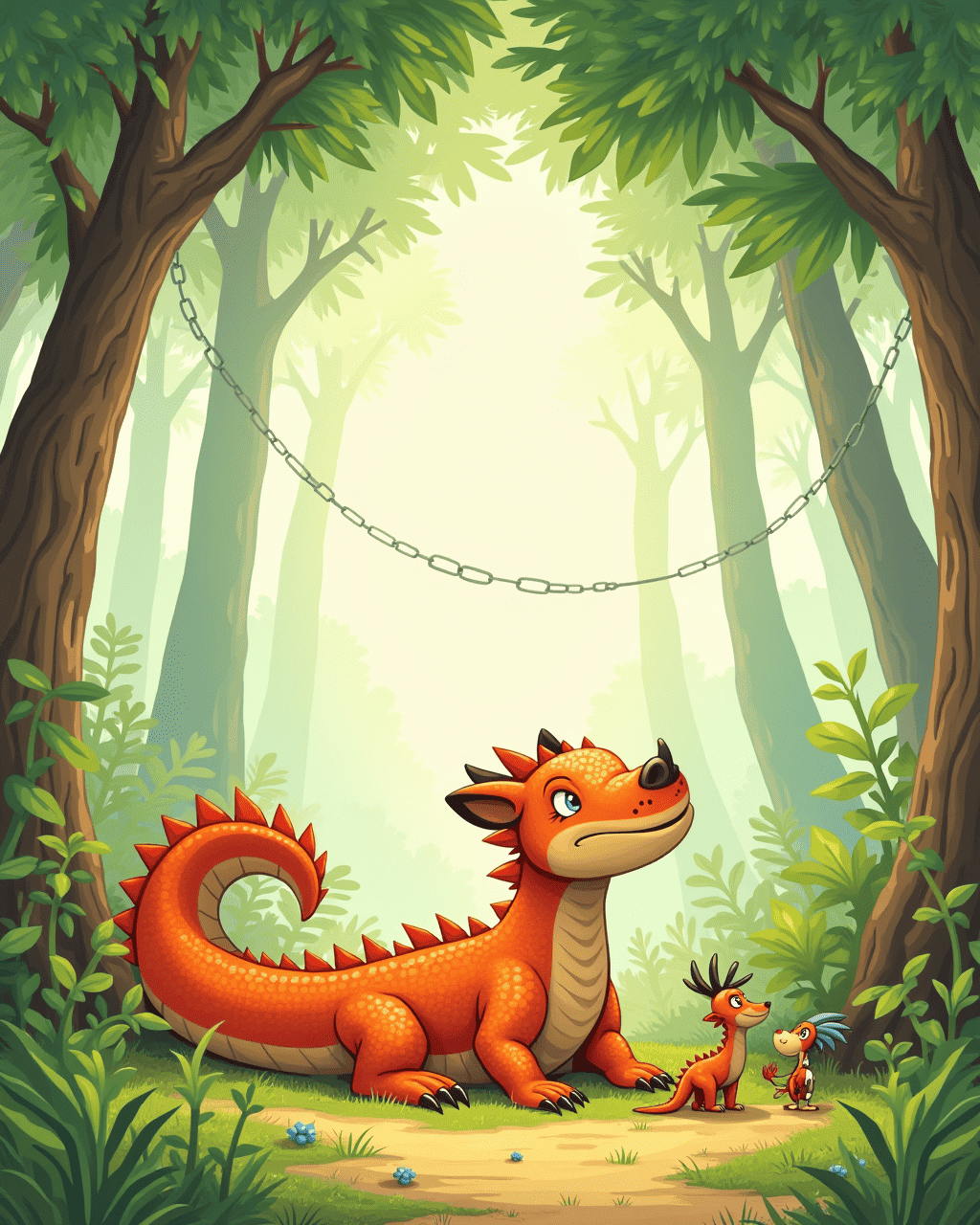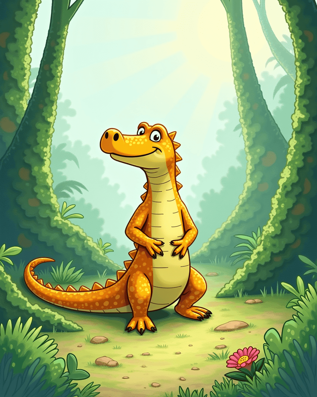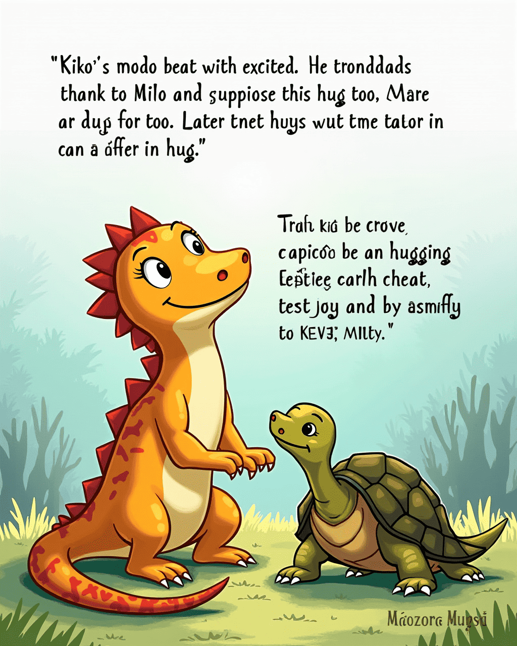 Kiko, a curious Komodo dragon, lived in a bright, green rainforest in Indonesia. He loved basking in the warm sun after a refreshing swim. Despite feeling strong and independent, Kiko wondered how it felt to be touched by a friend. Each day he looked at the other animals and felt a gentle longing for a hug. He dreamed of sharing a warm, friendly embrace.