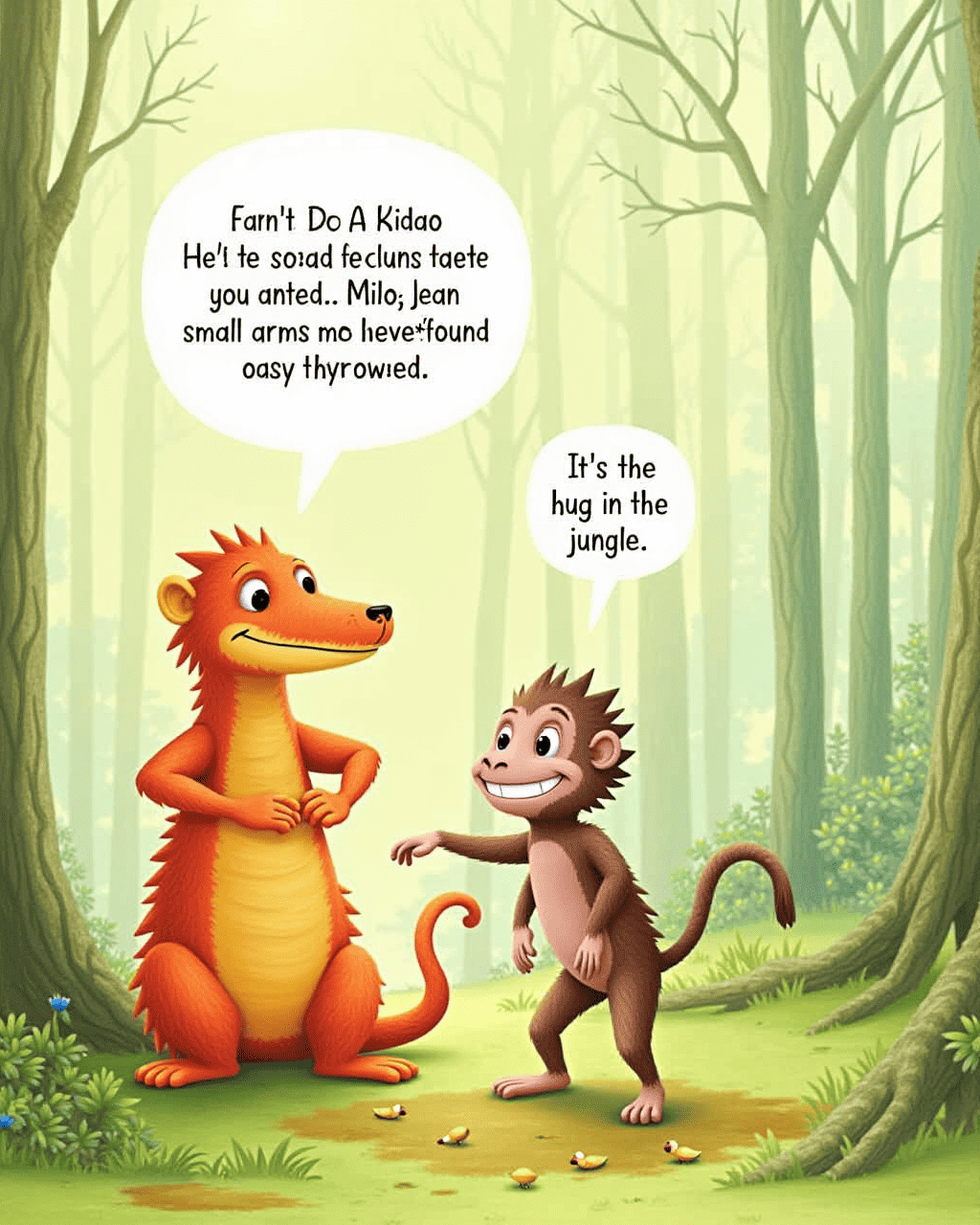 A friendly monkey named Milo lifted his small arms and gave a friendly squeeze. Kiko felt a warm, gentle pressure. He chuckled and exclaimed, “That’s amazing!” Milo grinned, “It’s the best hug in the jungle!” The forest birds sang a cheerful chorus.