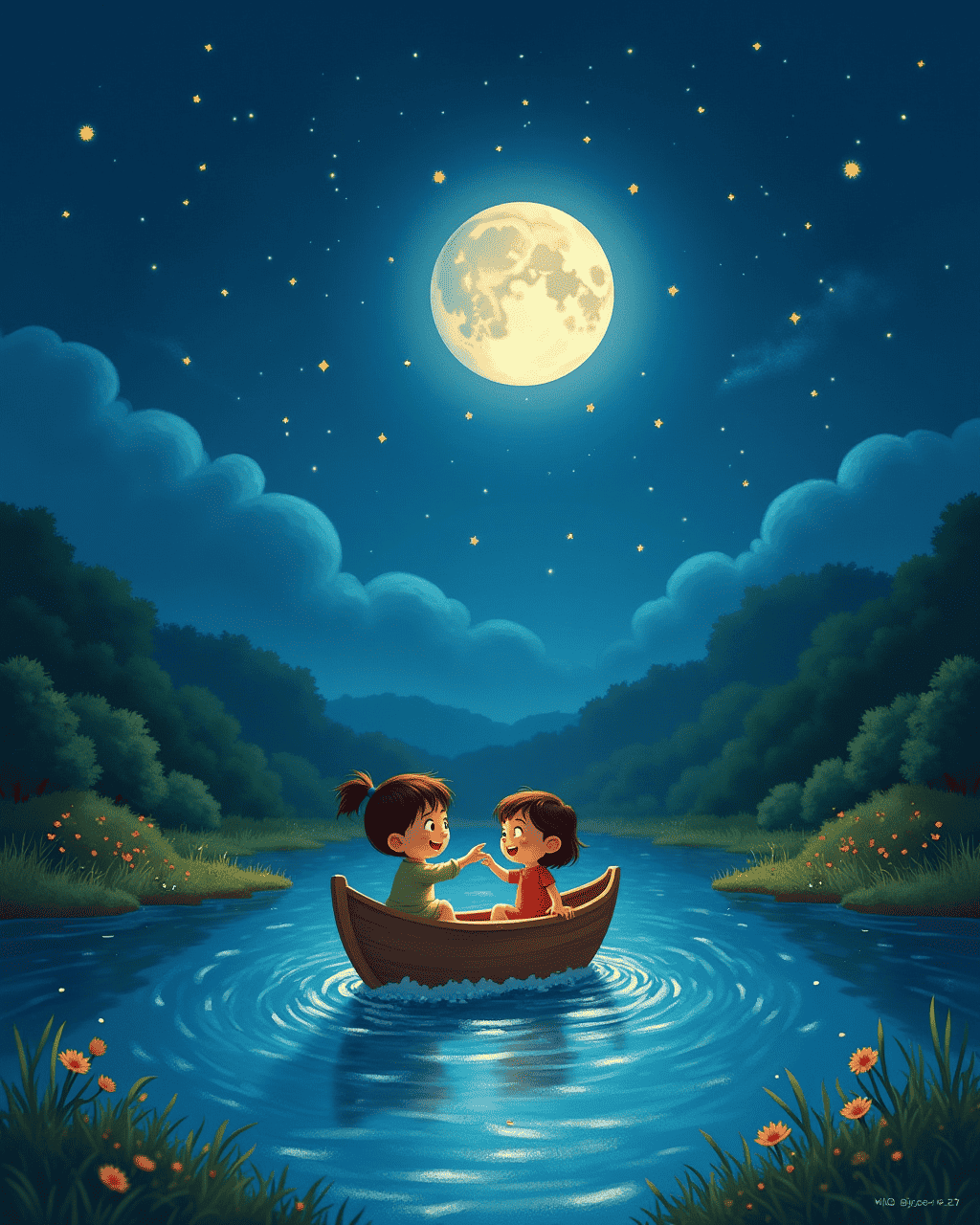 Milo follows a friendly girl named Lila. She points to a river that flows toward the stars. The water glitters like a sky full of fireflies. Milo decides to join her in a boat that floats on the upside‑down water. They laugh as the boat drifts toward bright constellations.
