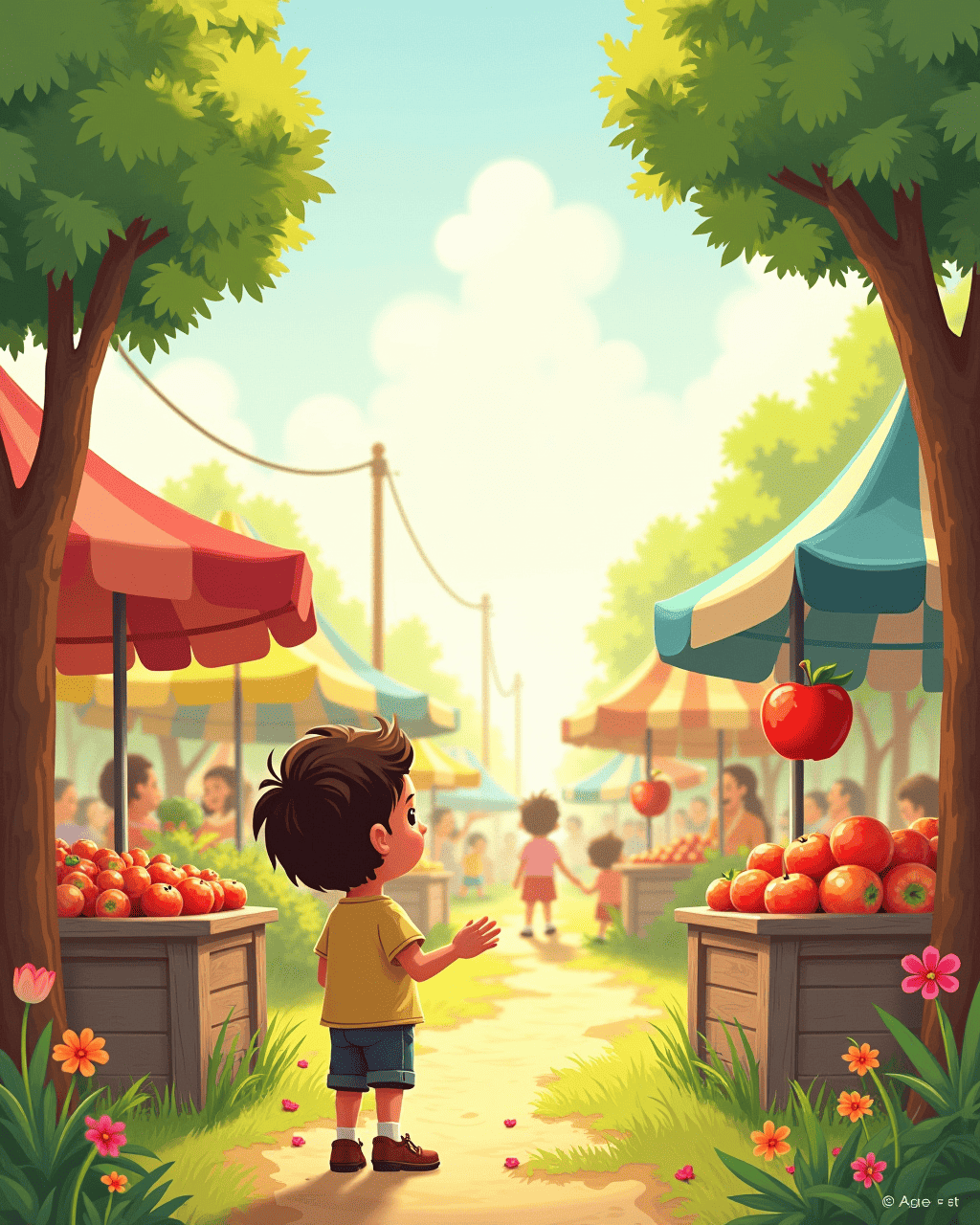 In the bustling market, Milo sees animals wearing shoes that float on air. He sees apples hanging upside down from trees. The vendors sell upside‑down cookies that taste like rainbows. Milo learns to balance himself while he buys a sweet snack.
