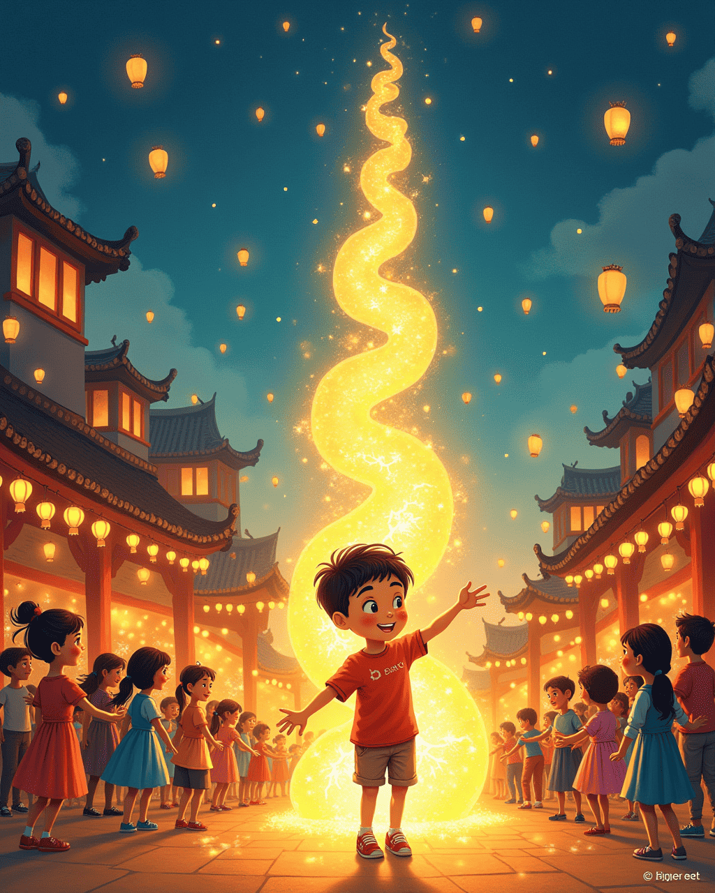During the Festival of Lanterns, everyone carries lanterns that shine from the floor to the roof. Milo’s lantern glows and paints his shoes with bright colors. He joins the traditional dance that spirals upward, twirling while his feet touch nothing but the light.