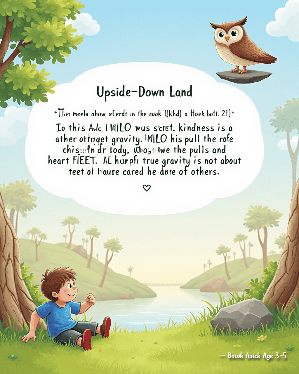 Milo meets a wise old owl perched on a floating stone. The owl shares the secret: in this land, kindness is the strongest gravity. Milo feels the pull of friendship, and his heart lifts happily. He realizes that true gravity is not about feet, but about who cares for others.