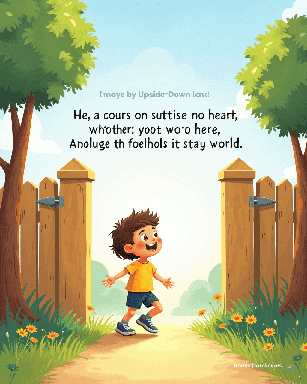 It’s time to return home. Milo steps through the gate, feeling lighter than ever. He looks back at the upside‑down world, grateful for the adventure. With a promise to stay upside‑down one day, Milo returns home, his heart full of new upside‑down memories.