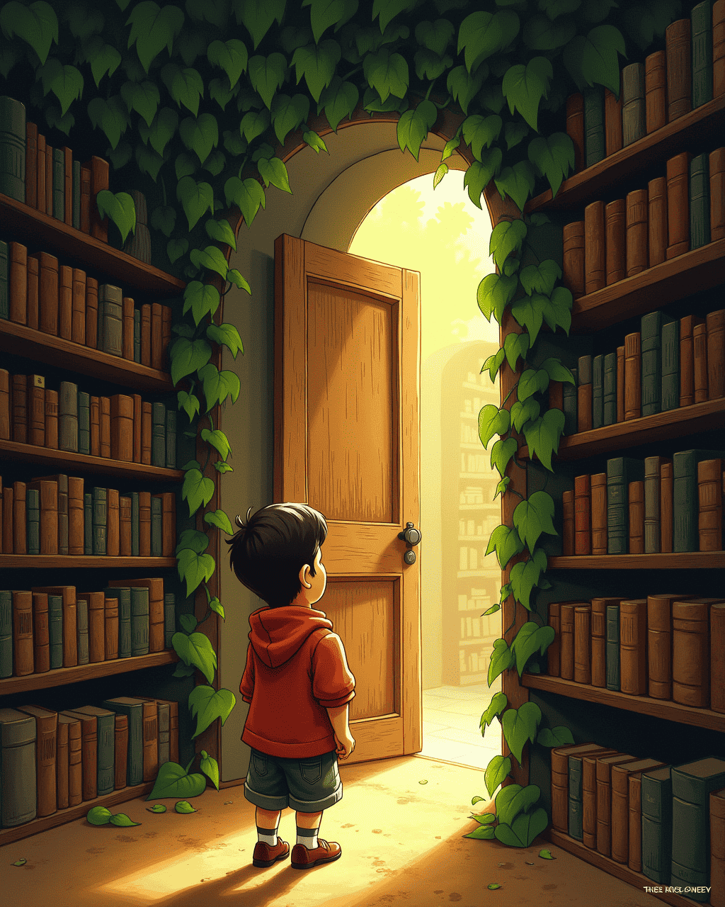 Tommy slipped through the iron curtain and was greeted by a room that smelled like old paper and dust. A tall wooden door stood ahead, covered in vines that seemed to pulse with gentle light. Inside, rows of shelves stretched far beyond his view, each holding books that glowed faintly when he walked by. He heard a soft whisper from inside one of the volumes, telling a story of a forgotten inventor. Tommy felt the excitement rise in his chest as he stepped onto the dusty floor.