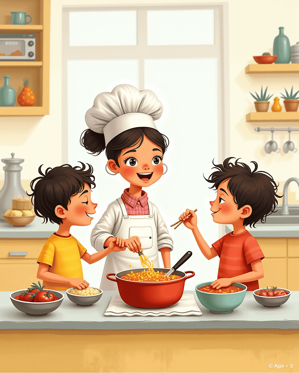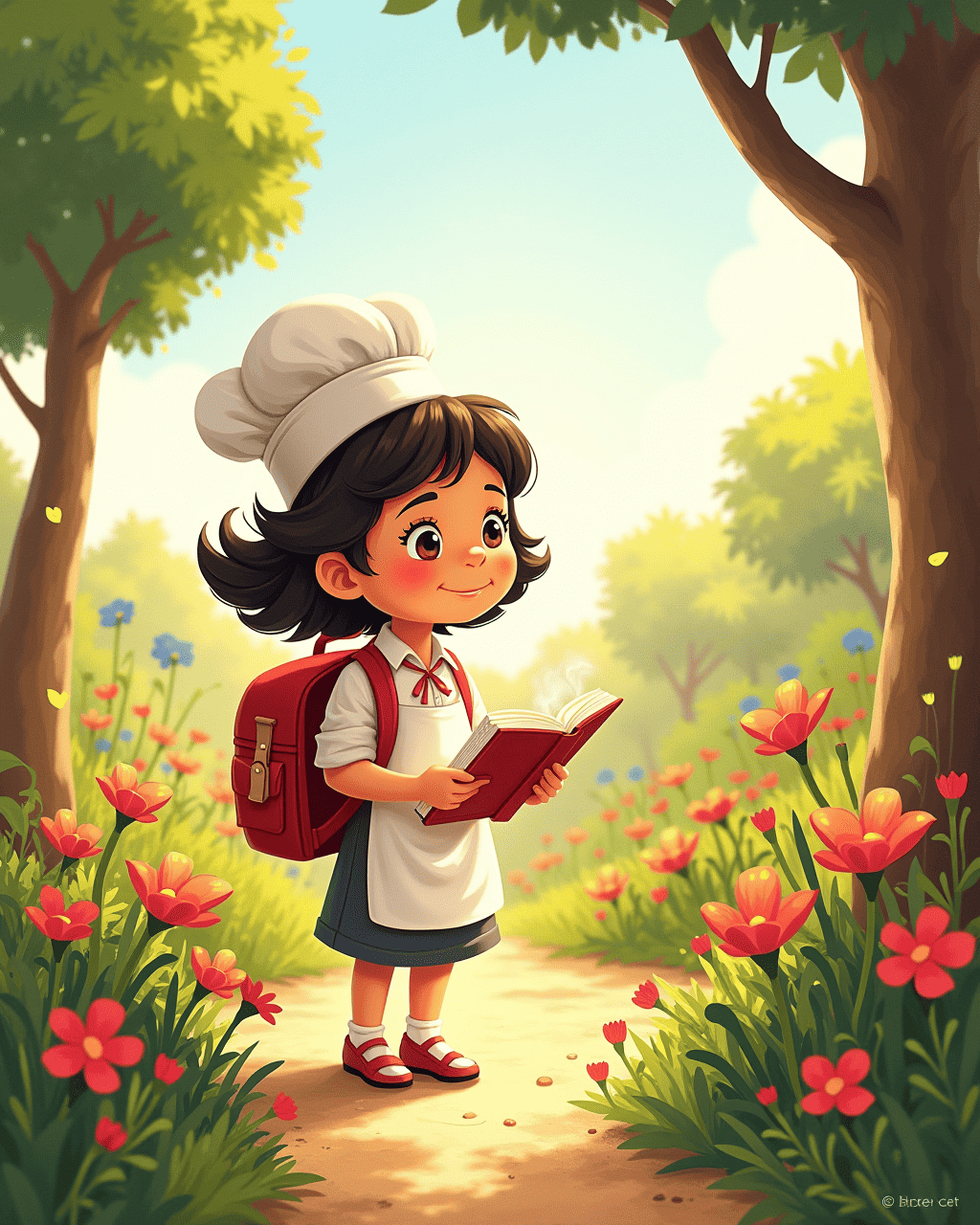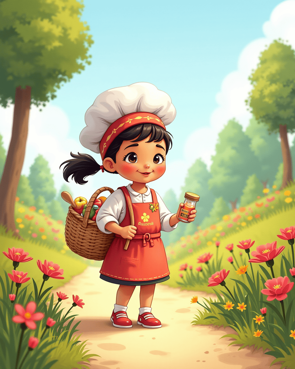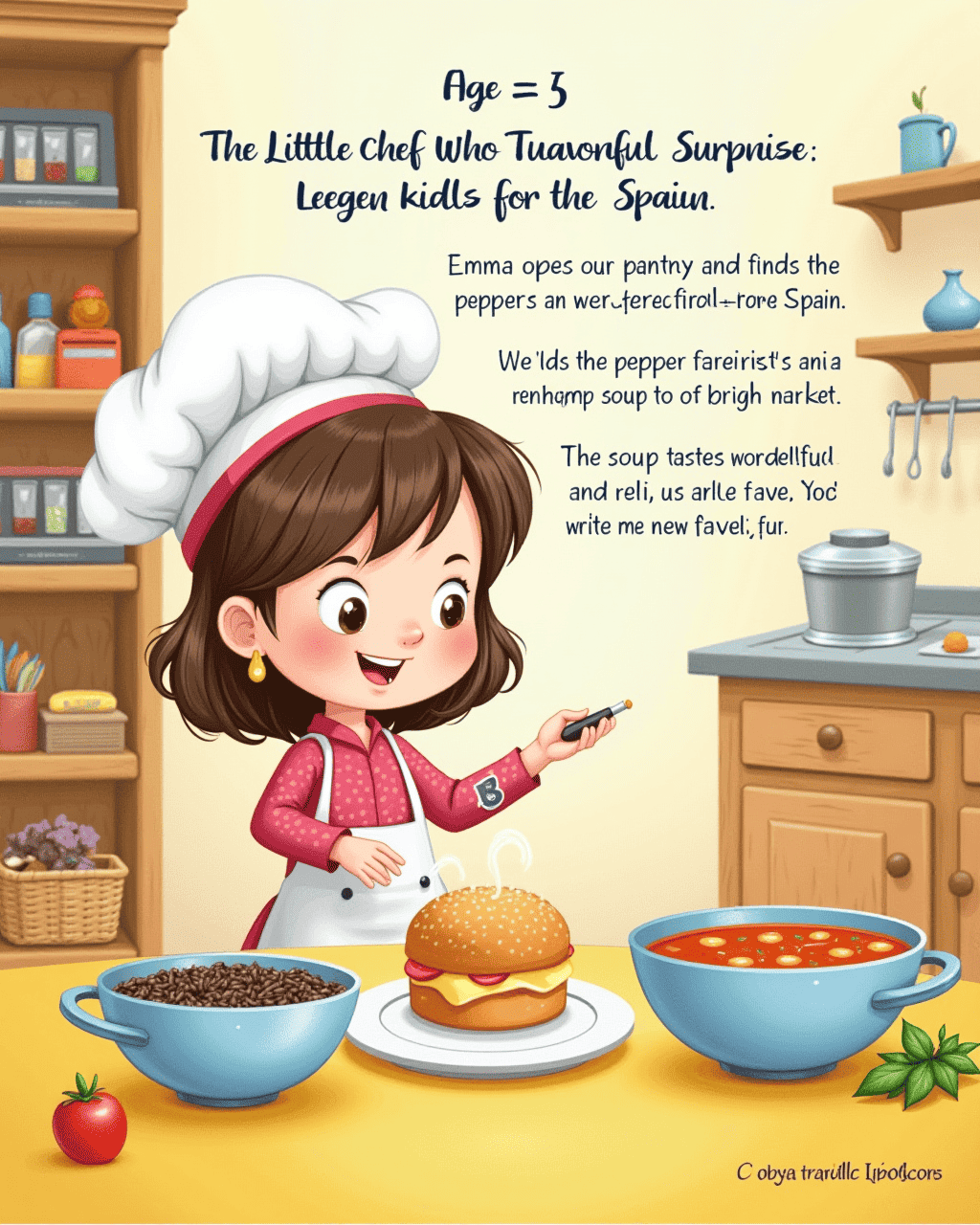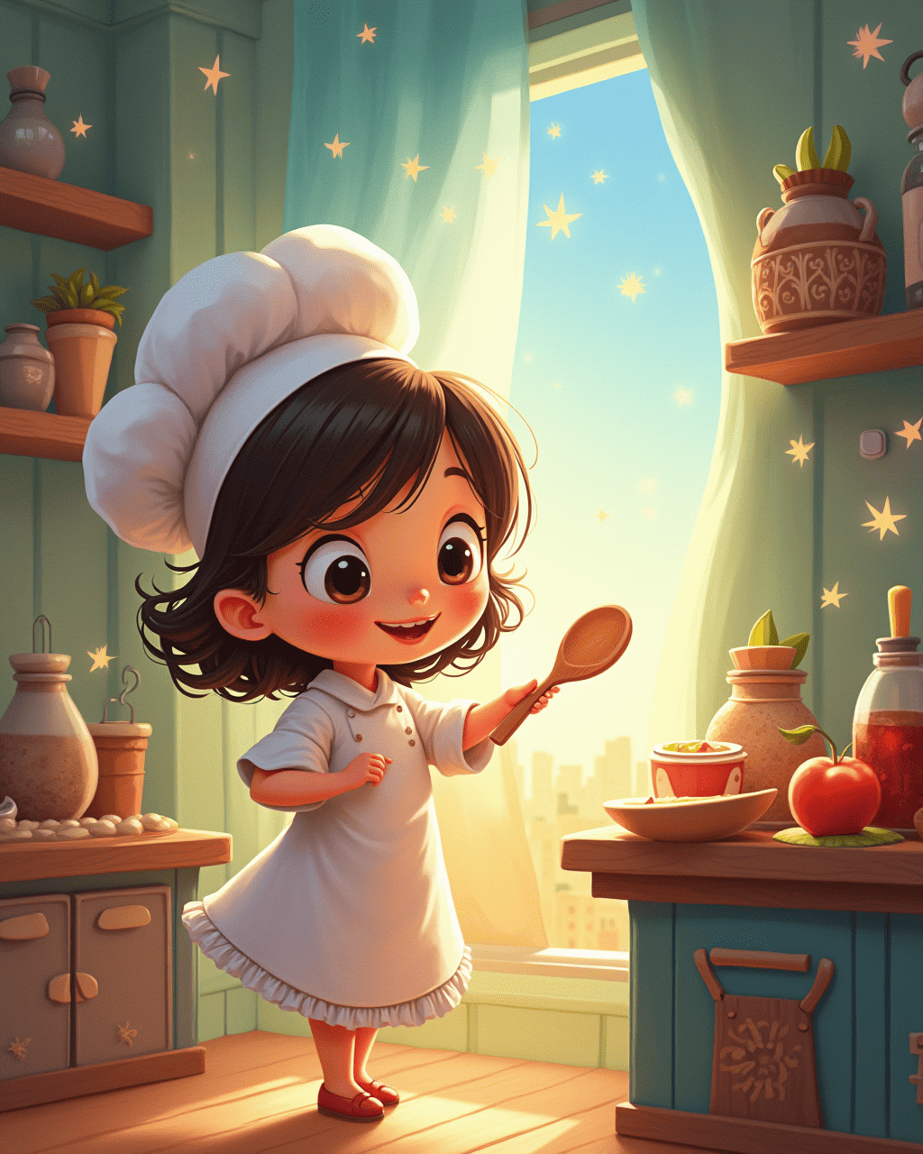 Little Emma lives in a cozy house with a tiny wooden kitchen. She loves to stir, whisk, and taste everything she can. Every morning, she dreams of the scent of distant spices. Emma’s father gives her a small wooden spoon that he says will bring her luck. Tonight, she decides to start a culinary adventure.