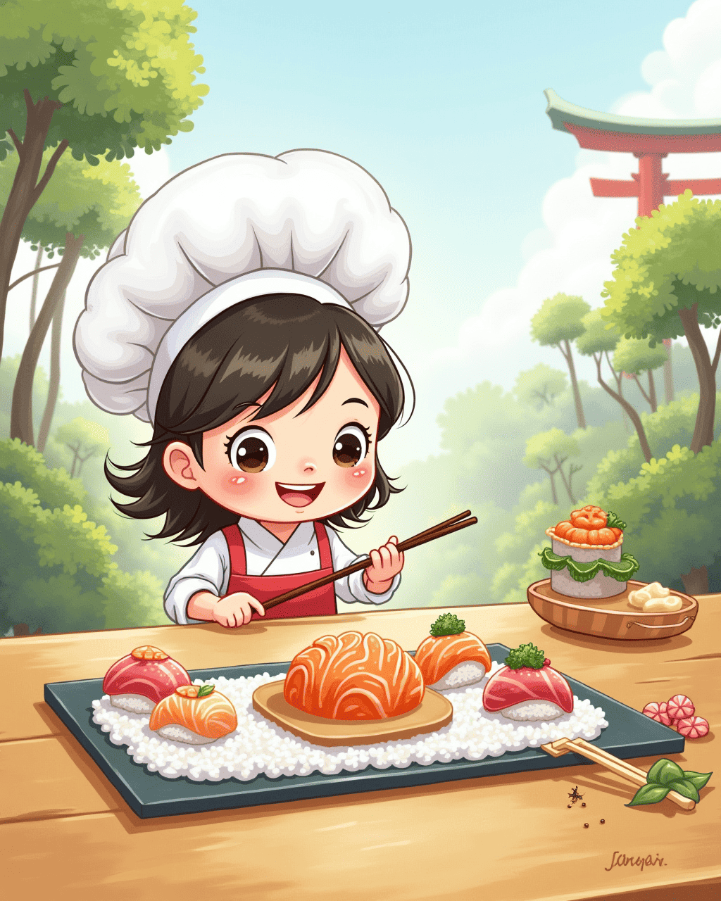 Next, the little chef flies to a bustling city in Japan. She watches a sushi chef roll rice, fish, and seaweed. She learns to fold a perfect nigiri. The chef says the secret is patience and gentle touch. Emma feels calm and excited about her next recipe.