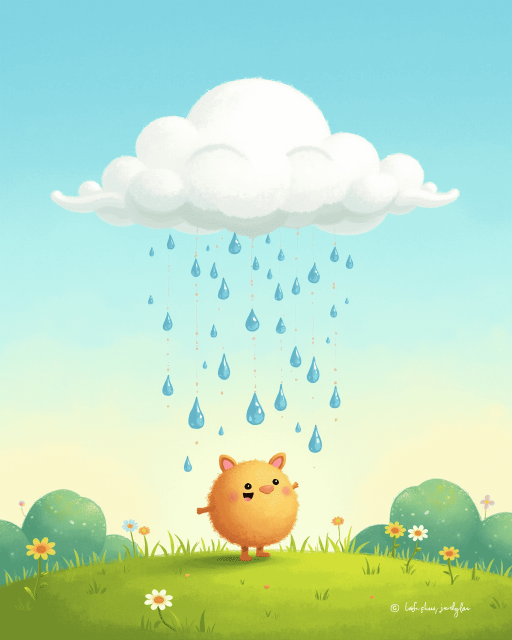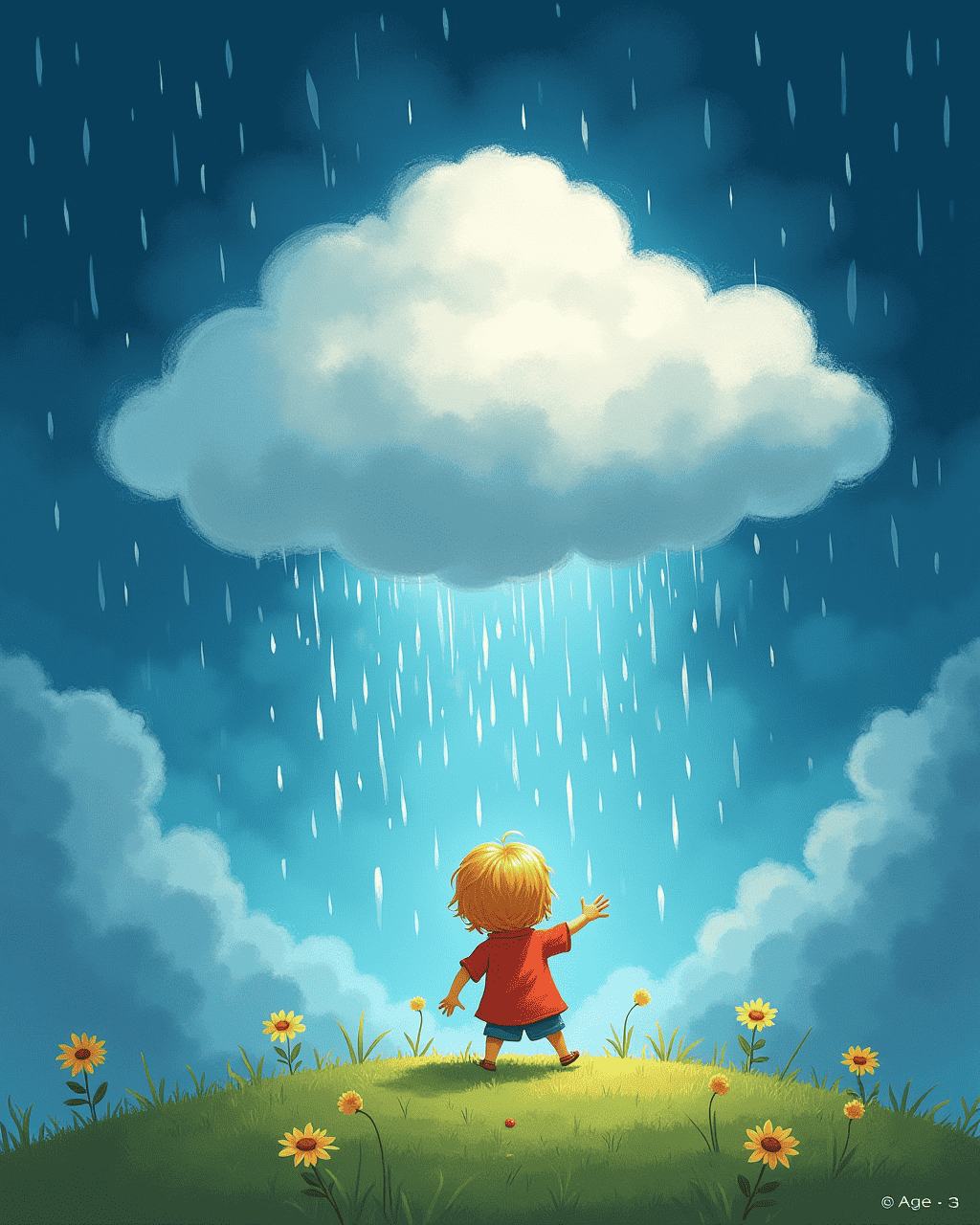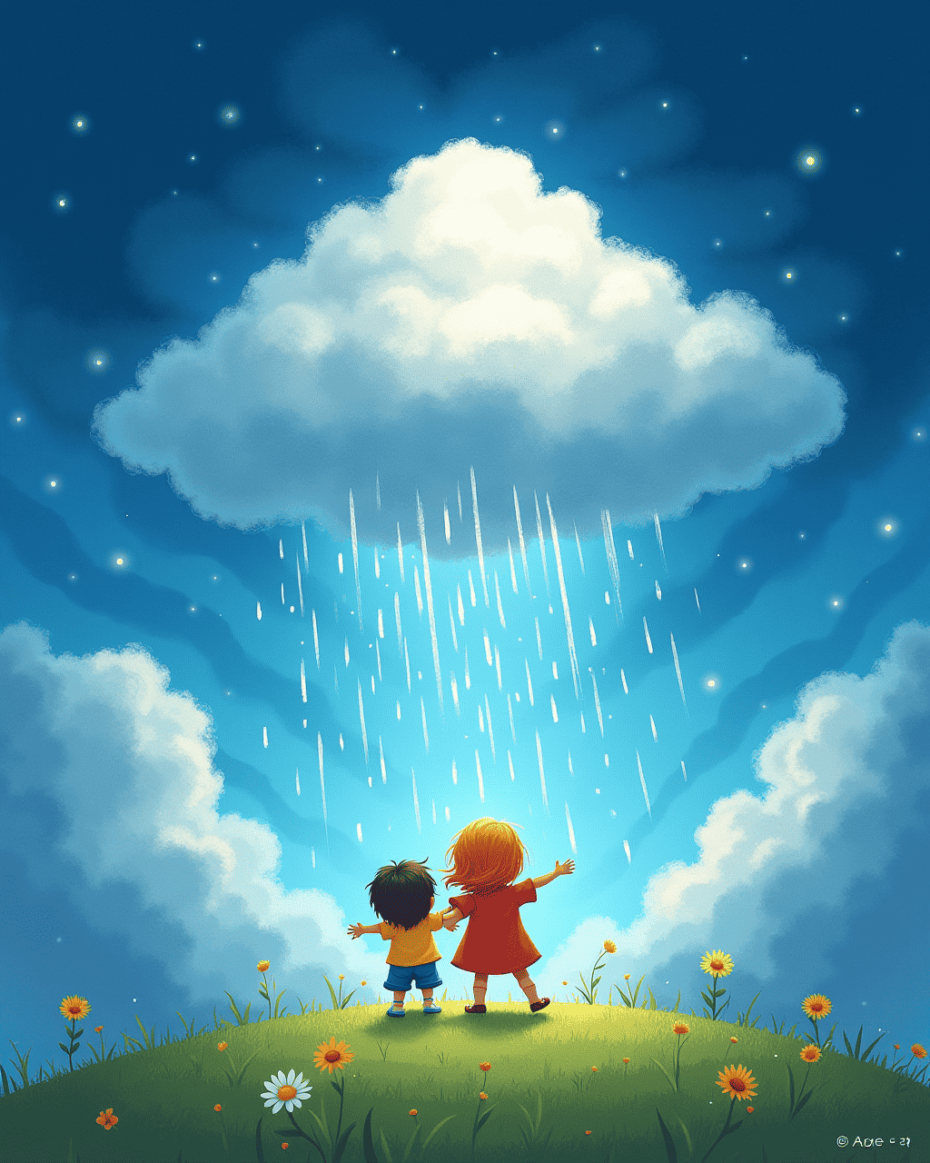 At dawn, the shy cloud carried a single drop. He let it fall into a thirsty field. The earth welcomed it with delight. The little cloud laughed happily. He felt his heart grow lighter.