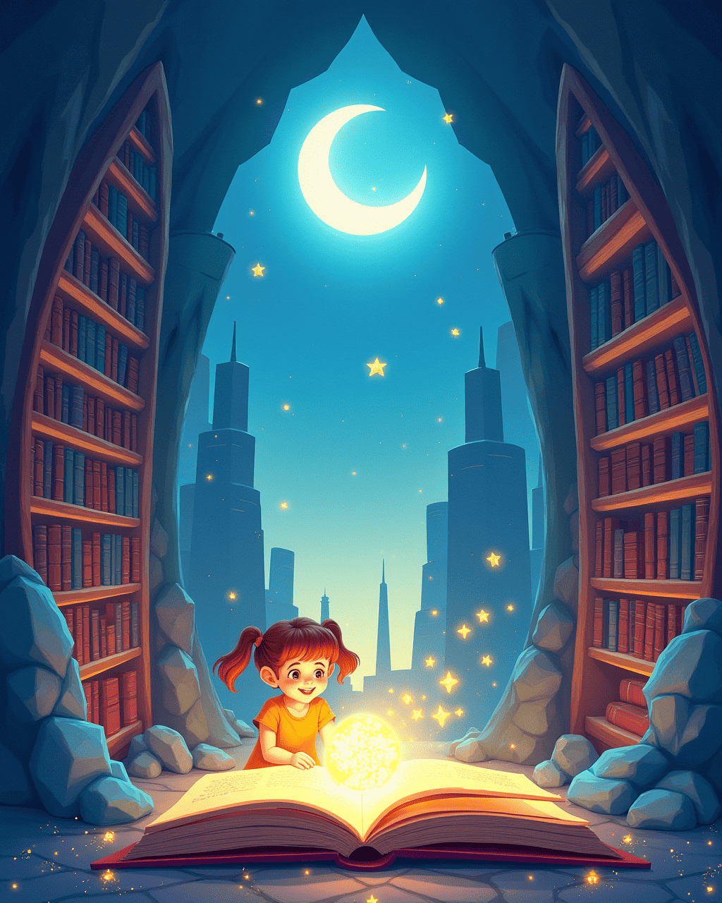 In the city’s heart, a crystal library held countless stories waiting.
