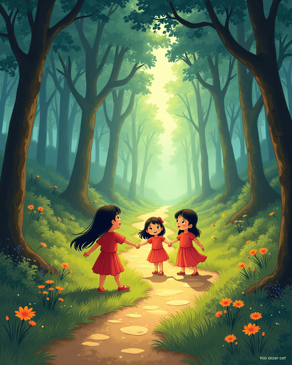 Little Mei found a dusty map in the attic. It showed a winding path through the Whispering Woods, where the Color Sprites lived. She gathered her friends, Kai and Jun, and they set out at dawn. The map promised a secret portal that guarded the lanterns’ glow.