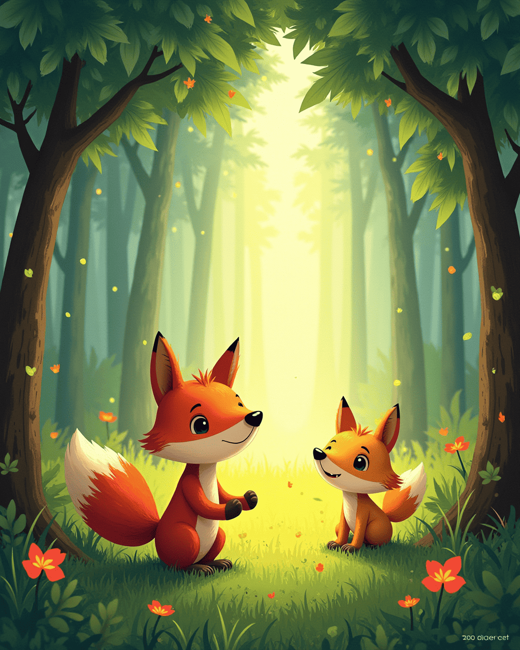 The woods were thick, and the leaves rustled like a soft lullaby. Suddenly, a golden fox appeared. It was the guardian of the Sprites and offered them a riddle. “What gives light without flame and paints the world without pigment?” The friends thought long, then answered: their own imagination.