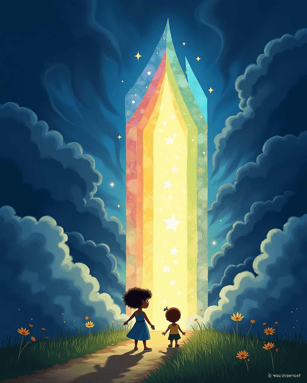 The riddle unlocked a crystal gate shimmering with all rainbow colors. Inside, the Sprites were dancing, but their wings had faded. They told the children that they had lost their spark because the villagers had forgotten how to listen to the wind. The children promised to remember and share the song of colors.