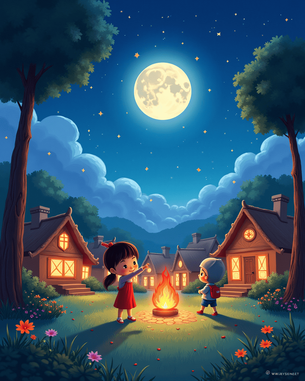 With the promise, the Sprites brushed their wings again, restoring bright hues to the sky. The village erupted in a burst of vibrant light as the Festival began. Lanterns floated like stars, and even the night sang a rainbow tune. Mei, Kai, and Jun returned home as heroes, and Lumin celebrated the Festival of Colors forever.