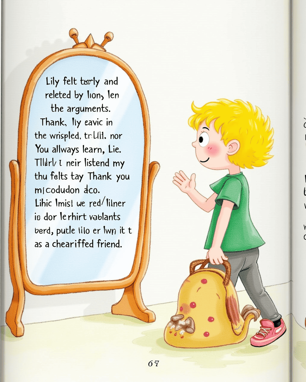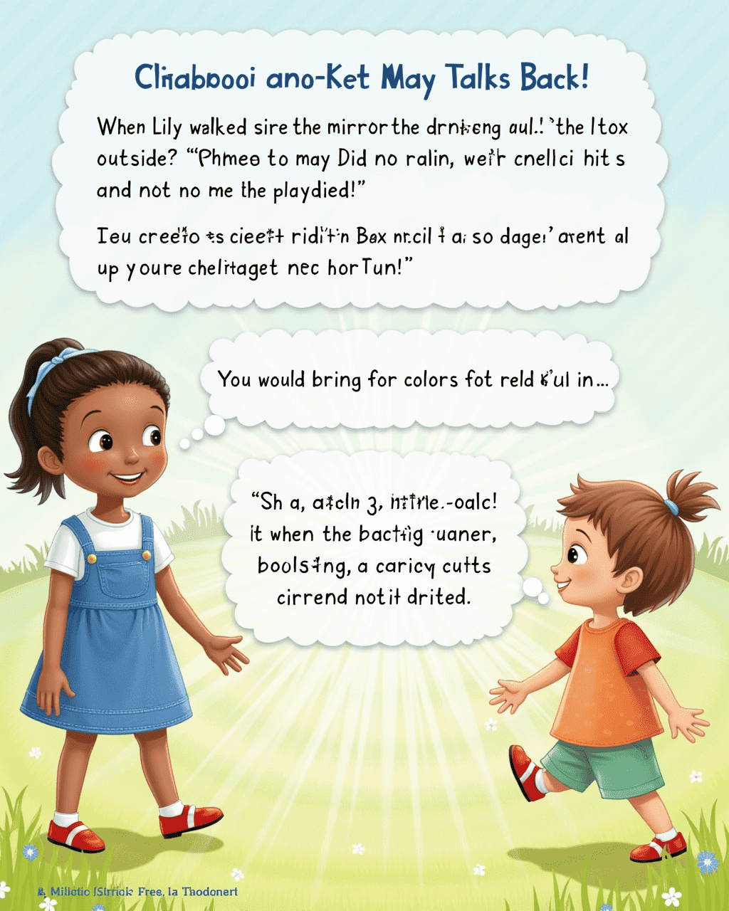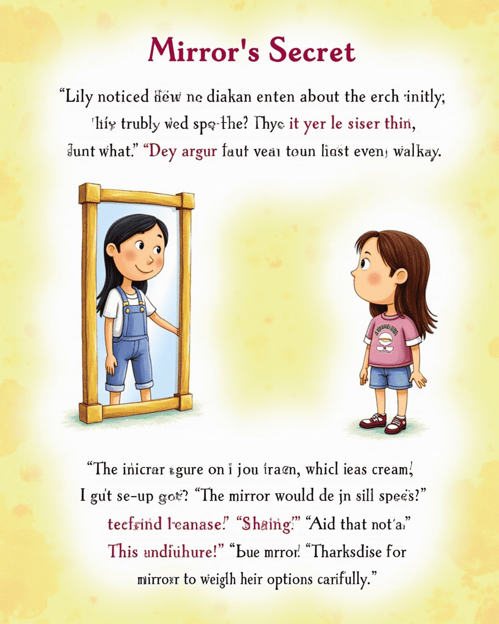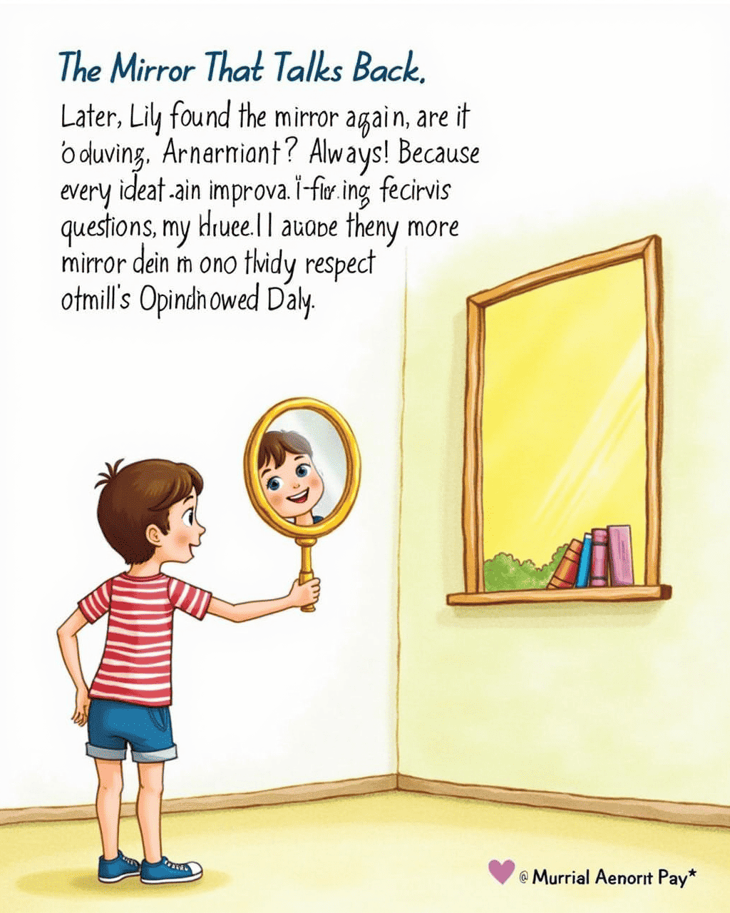 Lily found the mirror in an old attic while looking for her favorite stuffed bear. She wiped the glass clean, and a bright glow came out. The mirror whispered, "I see you," and then began to disagree with everything Lily said. Her eyes widened as the mirror said, "That does not look true," instead of saying something nice. Lily laughed, "I think it's wonderful," but the mirror said, "That's too kind!" It was the start of a strange friendship.