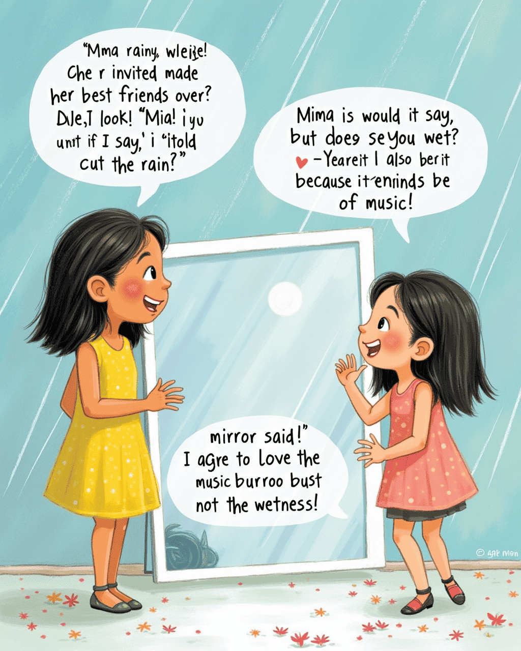 One rainy afternoon, Lily invited her best friend Mia over. "Mia, look! I have a talking mirror." Mia asked, "What would it say if I told it I love the rain?" The mirror said, "Rain is lovely, but does it ever get you wet?" Mia giggled and said, "Yes, but I also love it because it reminds me of music!" The mirror said, "I agree to love the music but not the wetness!" Their laughter made the mirror’s debates feel lighter.
