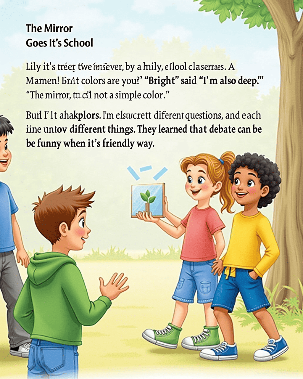 During school recess, Lily held the mirror with classmates. A boy named Tim asked, "What colors are you?" The mirror said, "Bright! But also deep. I’m not a simple color." Lily told her classmates, "The mirror can say many things." They all asked the mirror different questions and each time it answered in a new, different way. They learned that debate can be funny when it’s friendly.