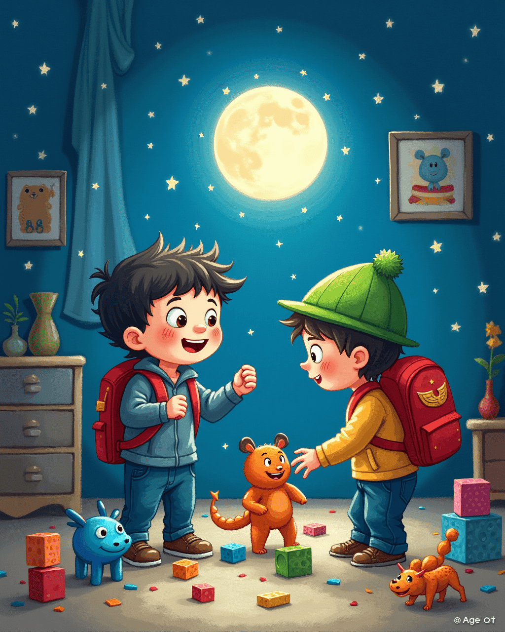 Tommy the little boy loved to play with his toys, but he never had a clean room. One morning, a sneaky monster appeared when Tommy was busy building a tower of blocks. The monster wore a bright green hat and carried a big red backpack. He whispered, "Let me help you tidy up!" and started pulling toys from the floor. Tommy watched in awe as the monster organized his space neatly, but something felt strange.