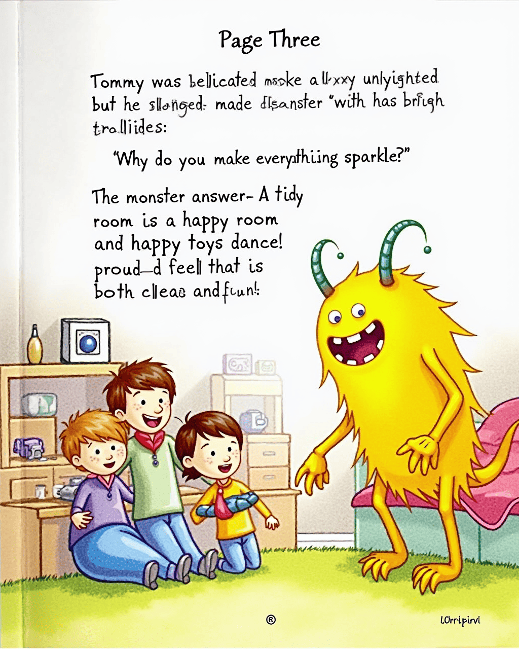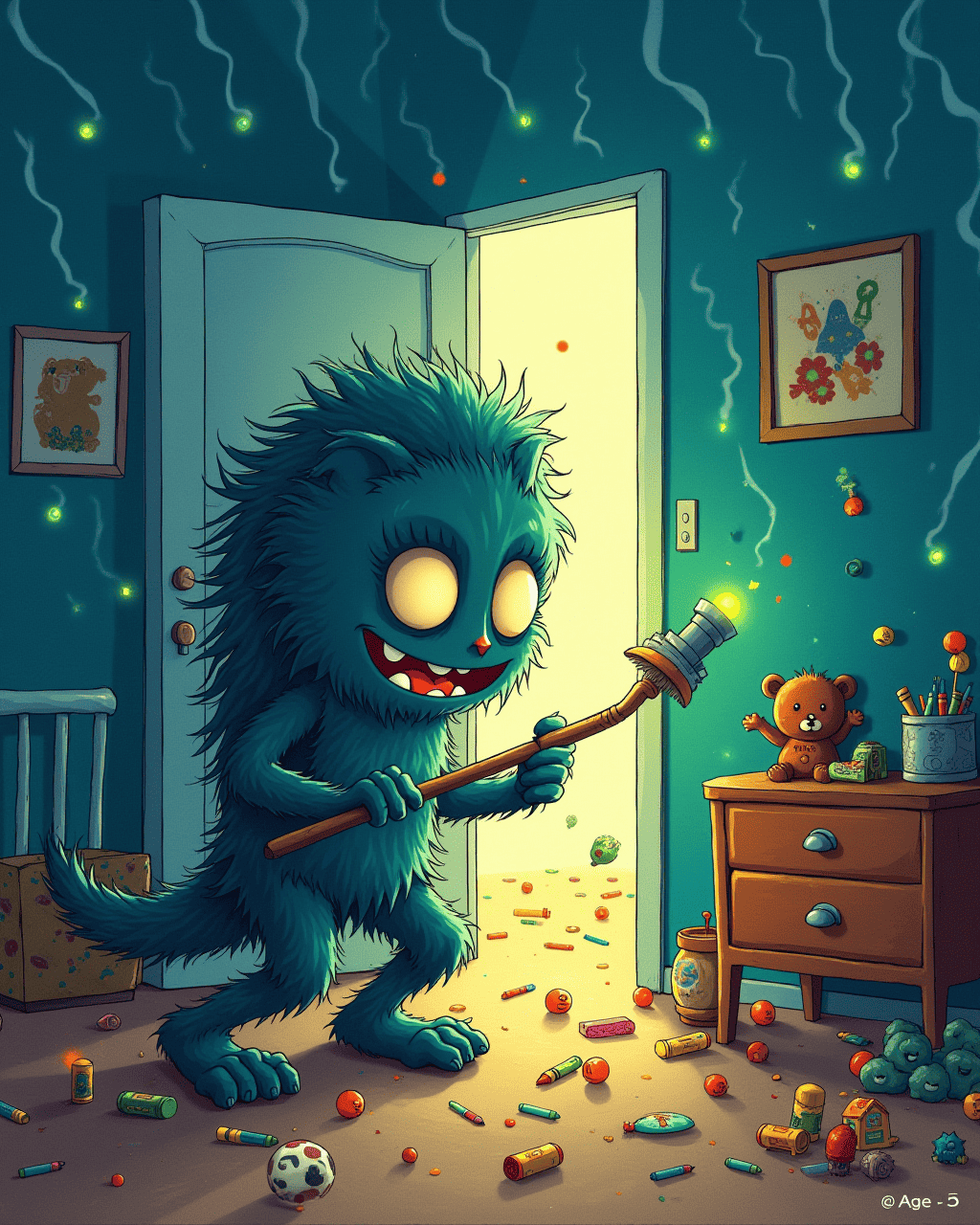 When Tommy closed the door, the monster turned a tiny green light on the wall. Suddenly, every toy began to hop and spin like tiny dancers. The robot toy jumped, the stuffed bear twirled, and the crayons bounced up and down. The monster laughed, saying, "I love a clean playroom, but I also love dancing!" He waved his broom and the floor glittered with rainbow colors.
