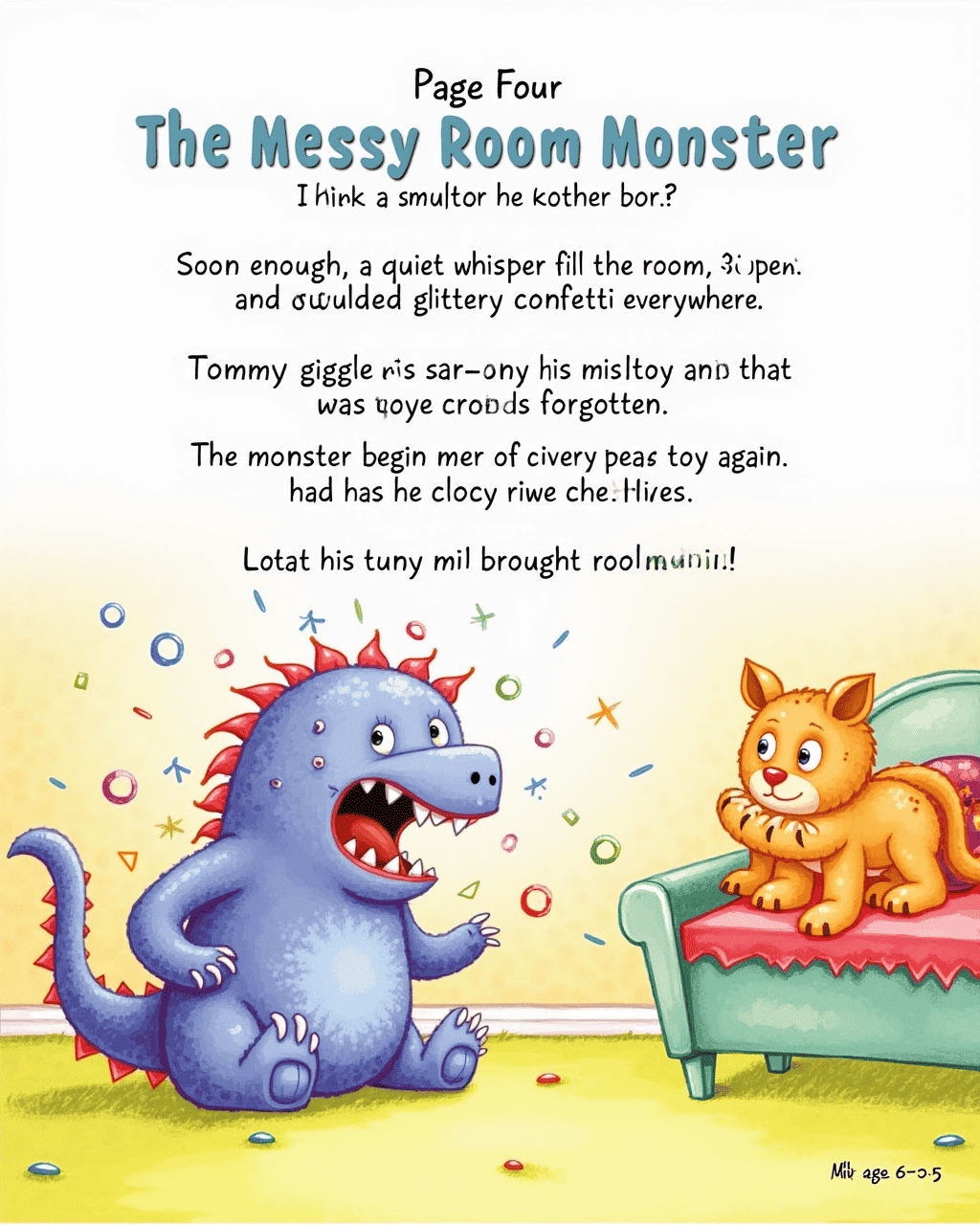 Soon enough, a quiet whisper filled the room. The monster’s backpack opened and poured glittery confetti everywhere. Tommy giggled, then remembered that every toy that was put in its place had been forgotten. The monster began to rearrange toys again, but this time he brought some fun.