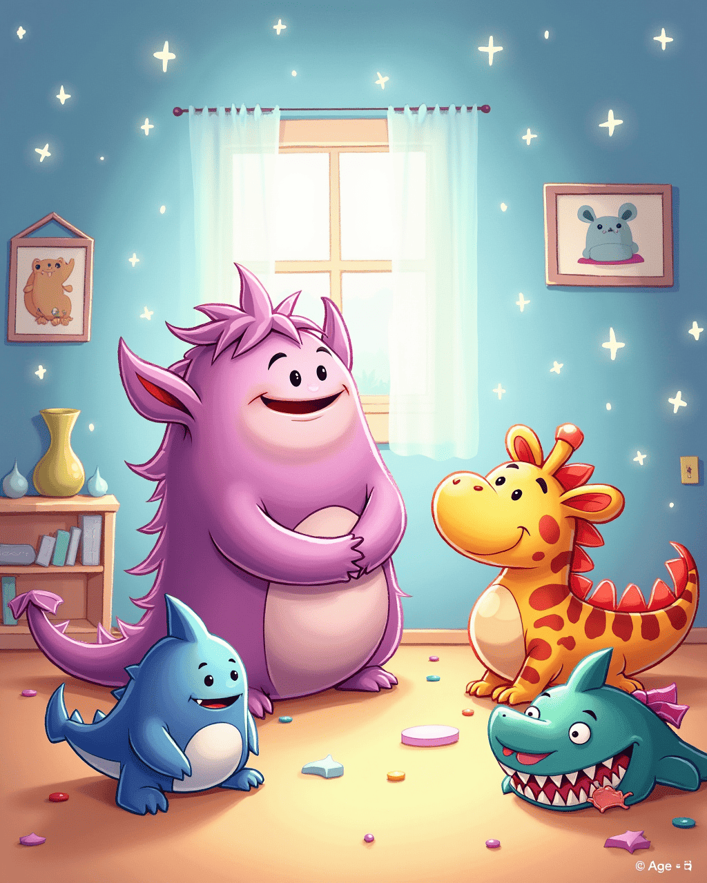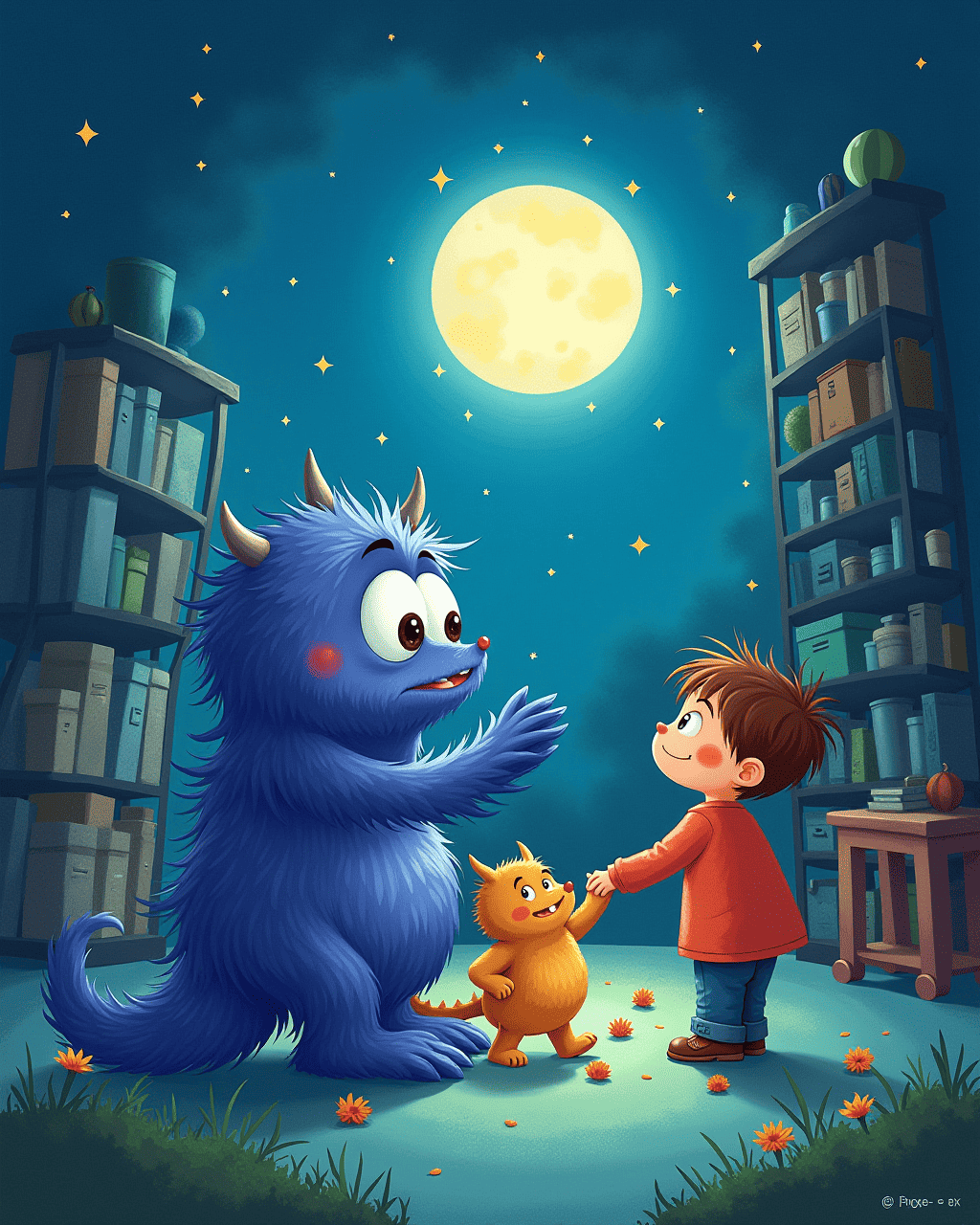 When the sun set, the monster whispered goodbye. "Remember, a tidy space and a joyful heart go hand in hand," he said. Tommy tucked all toys back into the shelves, and the monster waved as he disappeared into the night. From that day on, Tommy organized his room every morning, and each time he did, a tiny green light would glow, reminding him of the joyous monster.