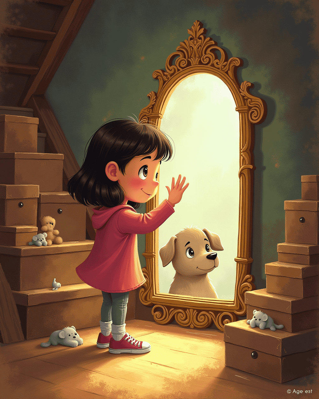 Lily climbs the creaky stairs to the attic. Dusty boxes line the corners. In the center sits a brass‑framed silver mirror. When she touches the silver glass, a soft glow lights the room. The mirror shows a blurry image of a playful puppy's eyes.