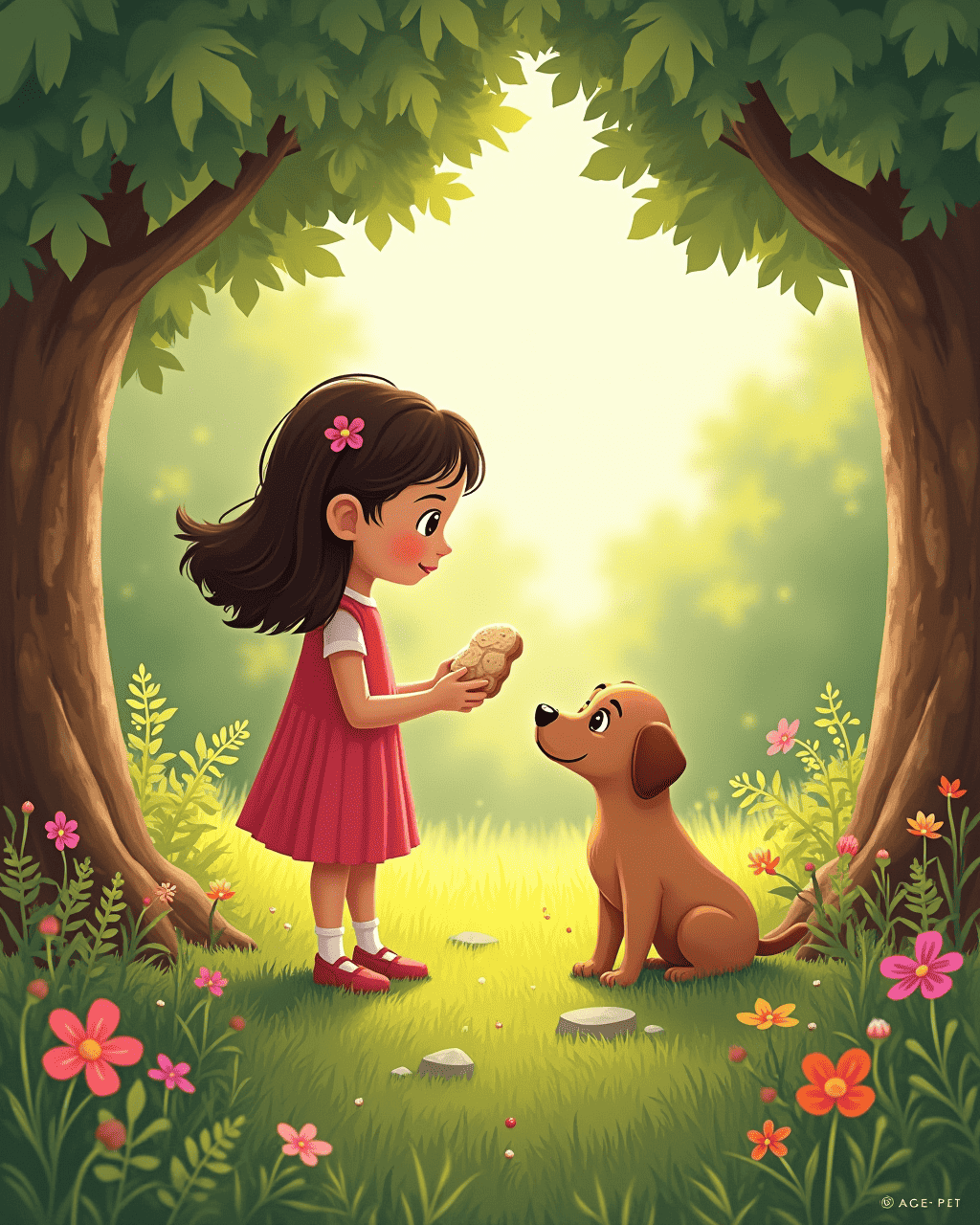 Lily follows the reflection's guidance to the nearby woods. She sees a shy puppy hiding behind an oak tree. The puppy trembles but is curious. Lily offers a crumpled piece of bread. They quickly become friends.