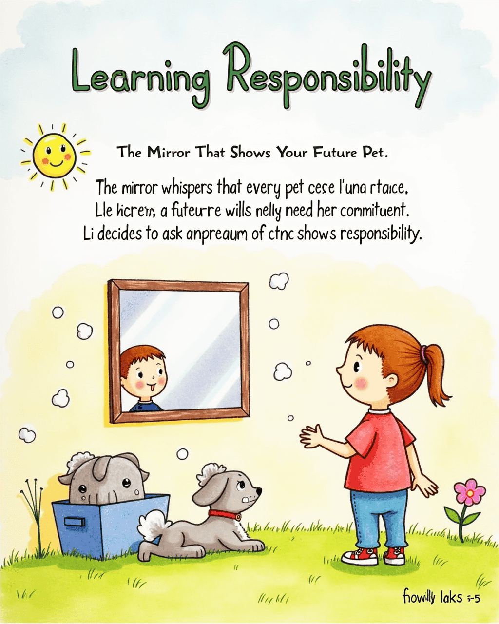 The mirror whispers that every pet needs love, time, and care. Lily thinks about her small dog. She knows a future pet will need her commitment. Lily decides to ask her parents for help. They agree if she shows responsibility.
