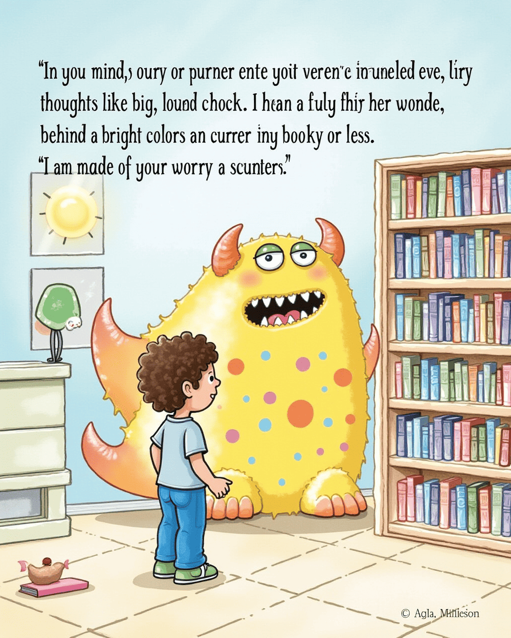 In her mind, the worry grows larger and sprinkles itself all over Lily’s thoughts like thunderclouds. Then, out of nowhere, a big, fluffy monster appears behind her bookshelf. The monster has many bright colors that change as Lily worries more or less. It growls softly and whispers, "I am made of your worries." Lily stands very still, her eyes fixed on the strange creature.