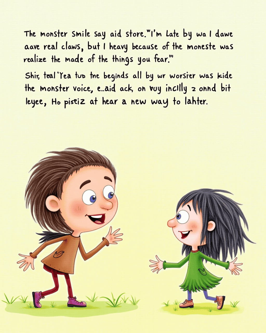 The monster smiles and says, "I have no real claws, but I am heavy because of the things you fear." Lily thinks of her first day at school and realizes the monster was made of her own thoughts. She begins to tell the monster all her worries one by one. Each worry makes a sound in the monster's voice, and he turns a bit lighter. She starts to hear a new way to talk.