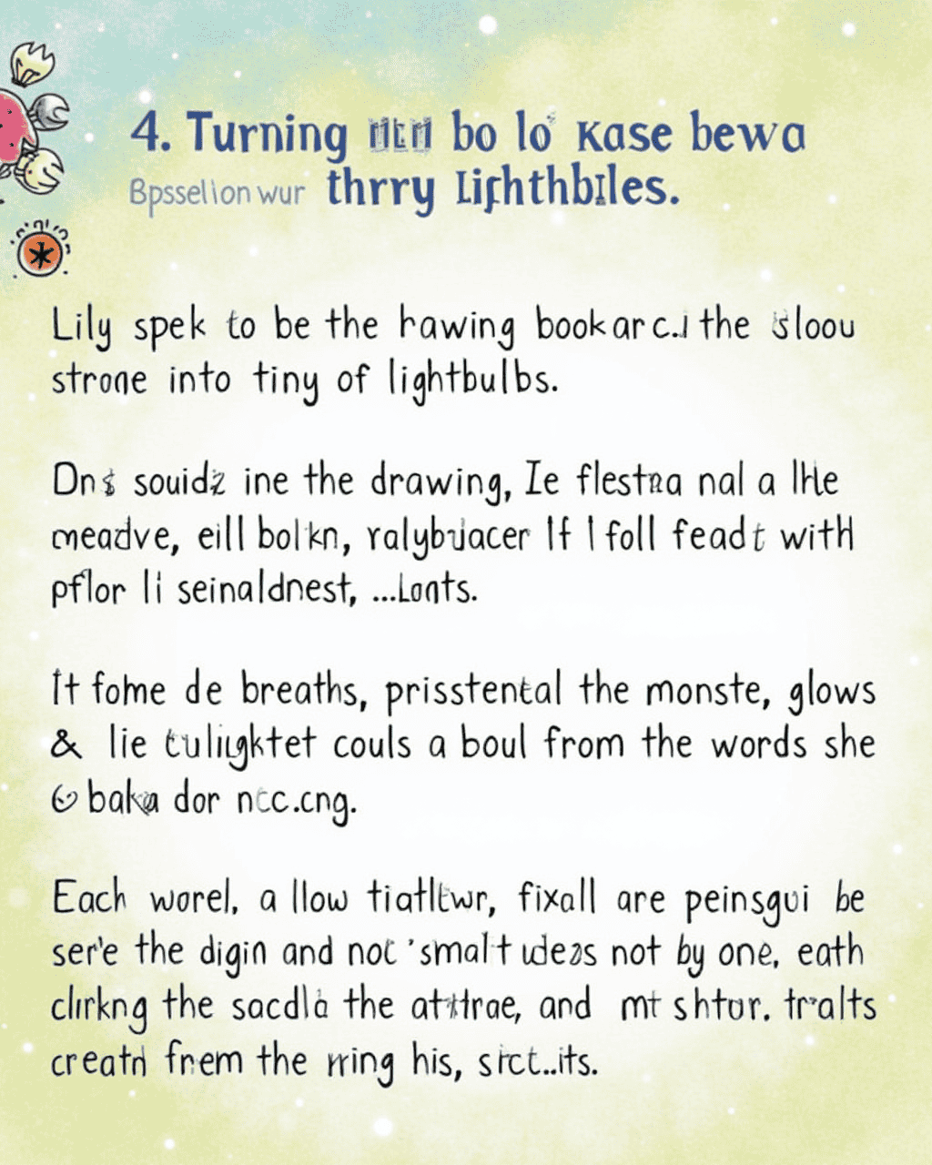 Lily pulls out her drawing book and draws the monster as a cloud of lightbulbs. She fills each lightbulb with a bright color and names them courage, patience, kindness, and curiosity. The monster glows brighter, and the cloud feels small and not scary. Lily takes deep breaths and says the words she drew one by one. Each breath takes a weight from the monster, and his fur turns shiny and friendly.