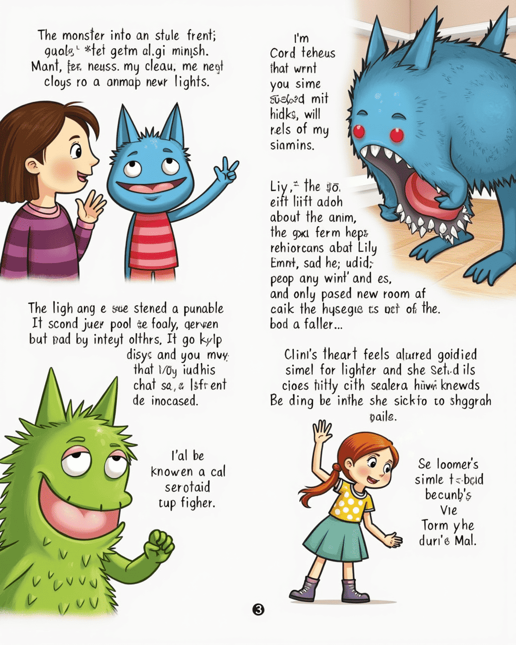 The monster, now turned into a gentle guide, says, "When you feel scared, remember these lights." It shows Lily that even fears make her stronger. She nods, and the monster lifts to high in the room, gently humming music. Lily’s heart feels lighter, and she begins to smile at the possibility of new friends. She realizes that the monster is actually inside her, a teacher she can talk to.