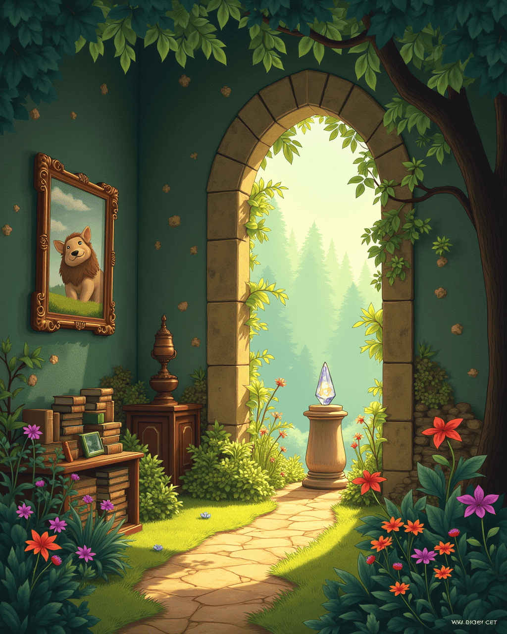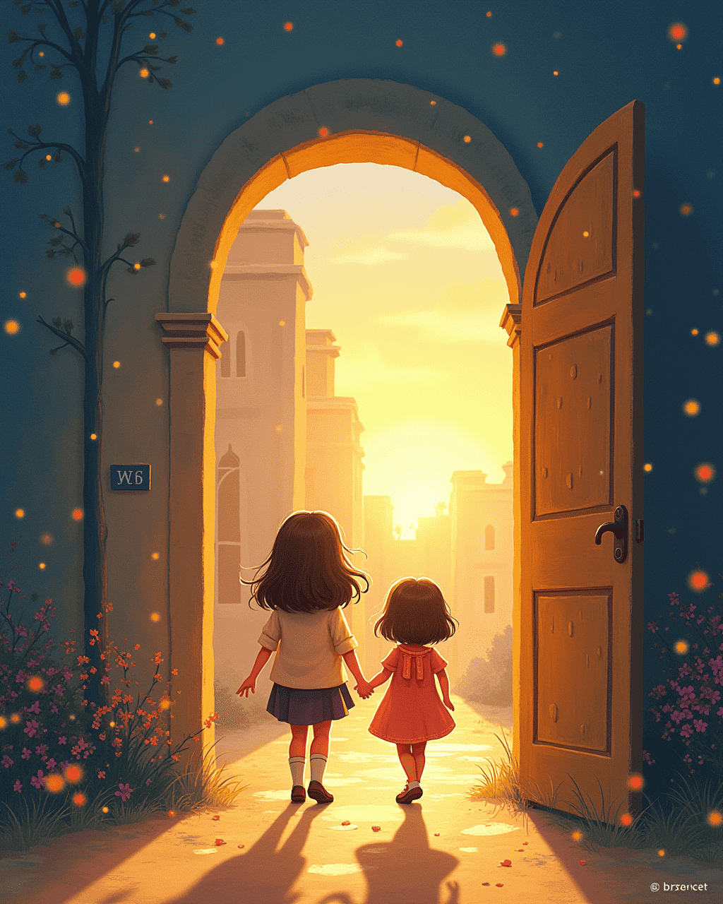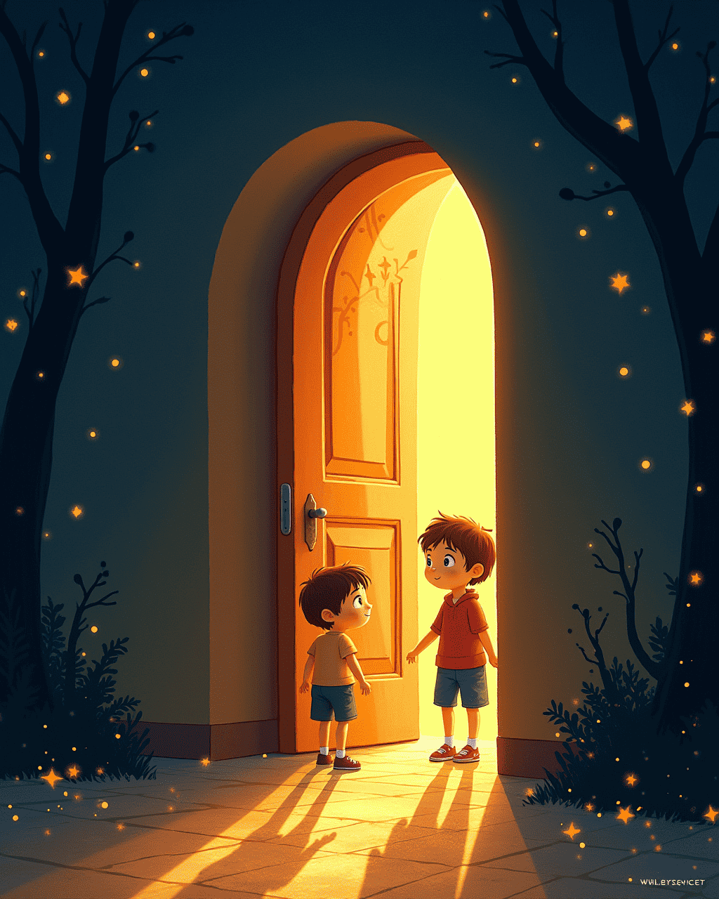 A wondrous adventure awaits behind the stone door. The children laugh as they step past the threshold, wondering what secrets lie within. The sun glints off the polished surface, promising magic to all who come.