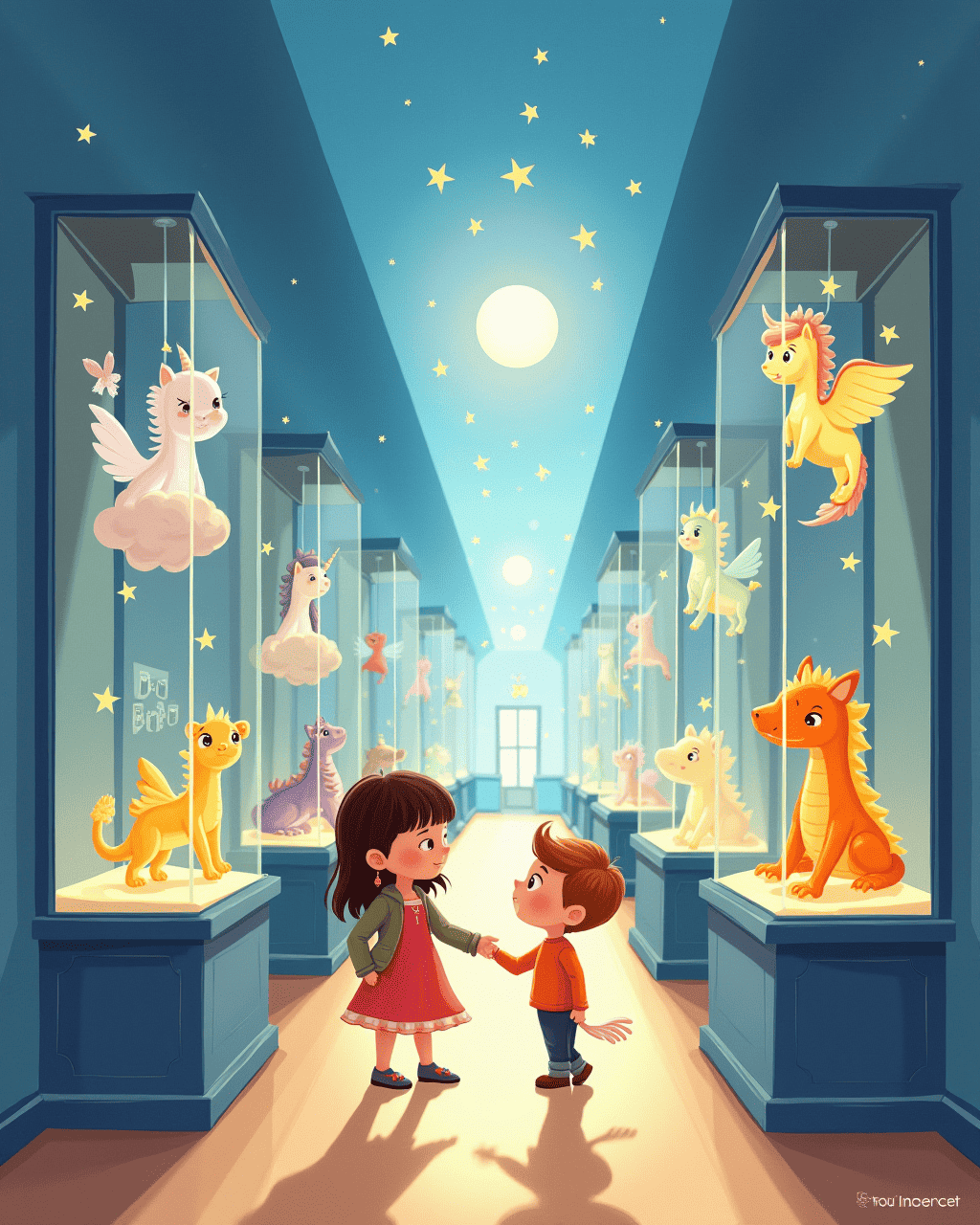 Beyond the foyer lay a long hallway lined with glass cases. In each case floated a creature made of clouds, each one whispering a secret to anyone who listened. Ellie tugged the ribbon of a small golden dragon, and it sang a lullaby that made the hall vibrate with joy. Max pointed to a translucent unicorn that gleamed like moonlight. The two friends giggled, delighted by the gentle hum of the whispering visitors.