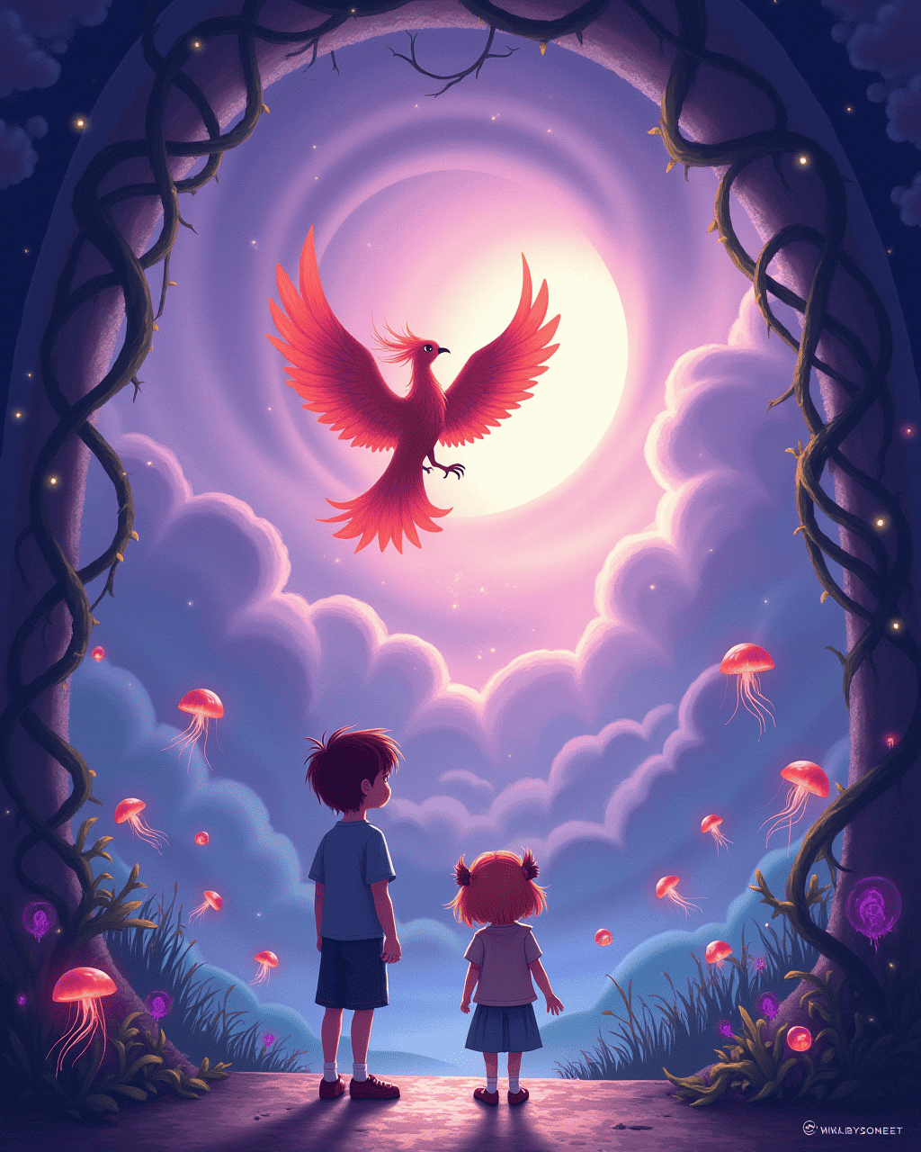 The gallery was a breathtaking dome where creatures floated in midair, surrounded by vines of crystal. The sky was a swirl of lavender and pink, and all the animals glowed with a soft, warm light. A tiny phoenix flew over their heads, leaving a trail of glittering sparks. Ellie whispered, "Do you think we could fly too?" Max laughed, "Only with a bit of imagination!" They spent time marveling at the rainbow-colored jellyfish that swam through the air.