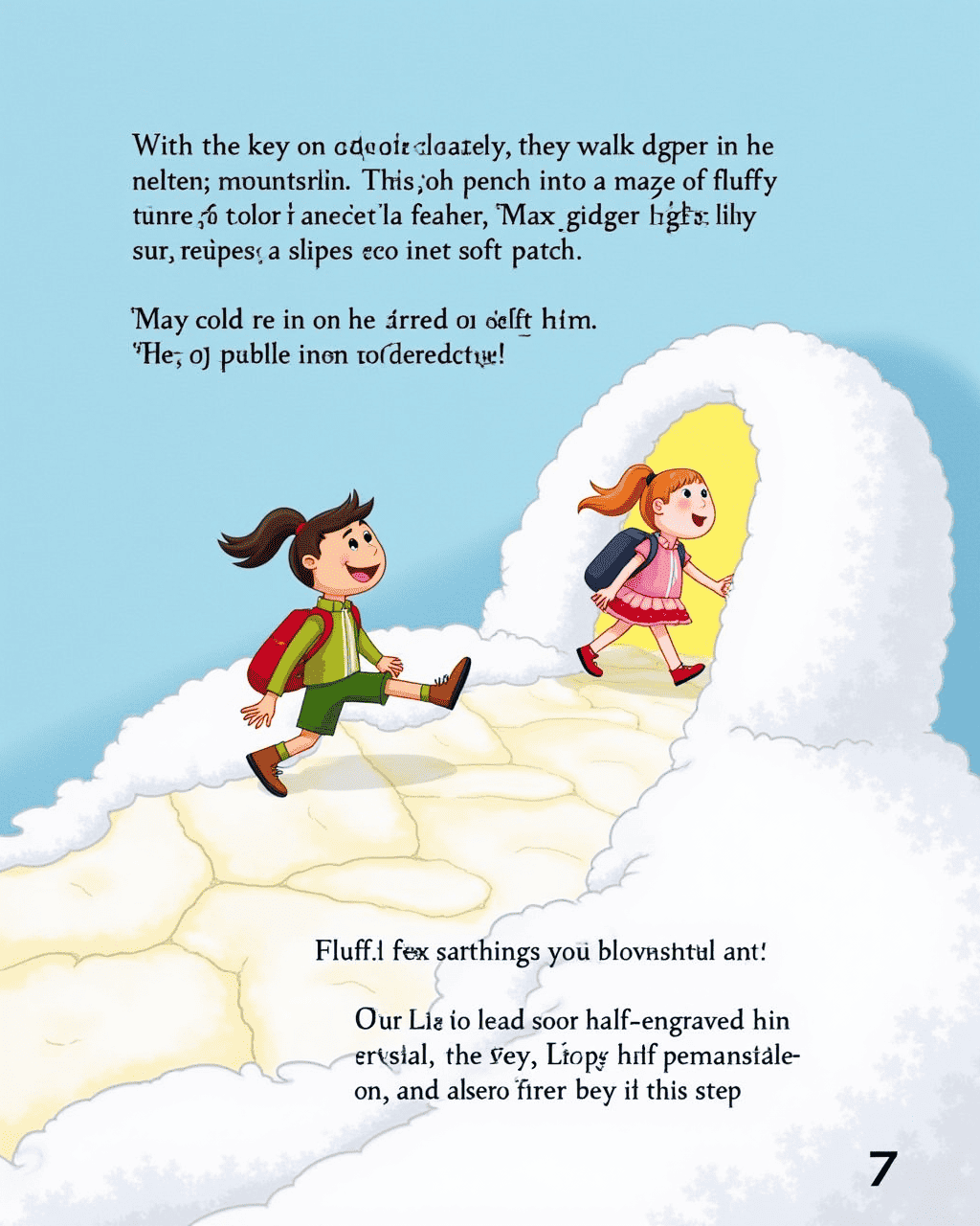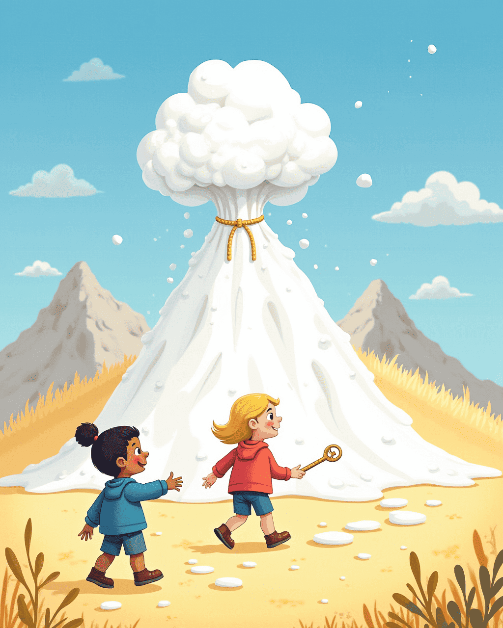 At the base, a trail of warm sugary footprints led higher. The ground smelled of vanilla and honey as the kids followed. Suddenly, a marshmallow cloud floated and split, revealing a glittering key wrapped in a ribbon. Ellie reached out and felt the key's coolness against her fingertips. She knew this key was a clue to a grand adventure.