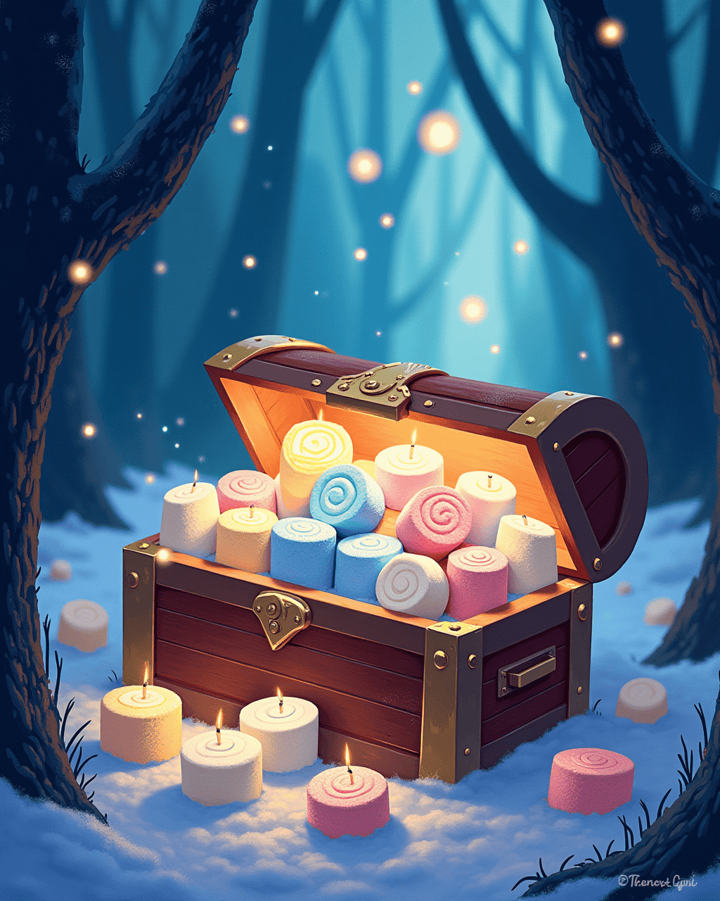 The chest was filled with glowing marshmallows of every flavor: mint, blueberry, chocolate, lavender. Lily tasted a blueberry one and felt it burst with happiness. The mountain's magic was about sharing and kindness. They decided to keep some and share the rest with their family.
