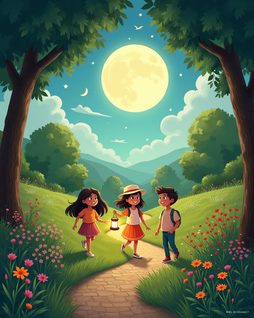 At the oak tree, the friends discovered a gate covered in ivy that led into a garden where the plants appeared to whisper under the moon. The air was cool and sparkling with dew, and the lantern light seemed to dance among the leaves. Sarah pointed to a glowing stone that pulsed like a heartbeat, directing them further into the garden. Each step through the garden felt like walking into a storybook, and Max laughed, feeling the thrill of the unknown. They followed the stone's glow, which revealed a spiral path that wound deeper into the garden.