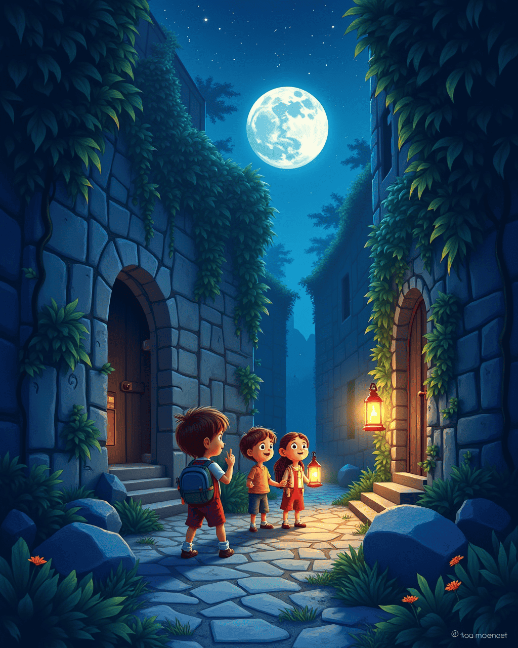 The spiral path turned into a narrow alley lined with crystal stones that reflected the moonlight in rainbow colors. The children could hear a faint echo of their footsteps, adding to the sense of mystery. Tom noticed a hidden door in the alley that swung open when they approached, leading to a dark corridor. Inside the corridor, they could see a faint glow coming from behind a curtain of vines. With Lily's lantern, they stepped into the corridor, discovering a small room filled with ancient maps and a single, glowing lantern.
