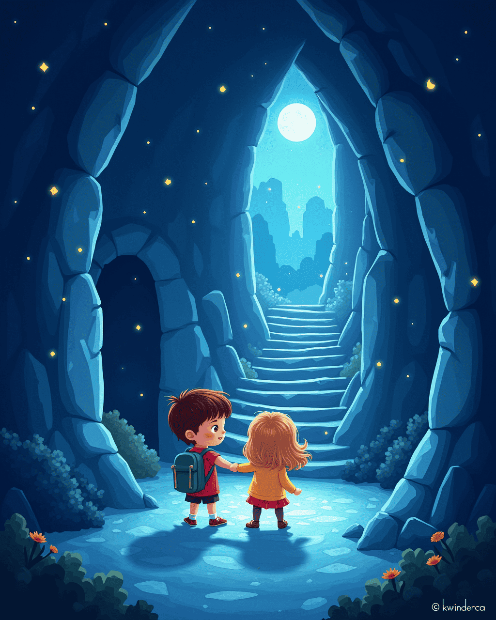 The room turned out to be a crystal chamber where the walls were made of shimmering quartz. The lantern's light bounced off the crystals, creating constellations on the floor that matched the real night sky outside. Max found a hidden compartment that held a key made of silver and etched with moon symbols. As they lifted the key, the chamber shifted slightly, revealing a hidden staircase that led down into darkness. The friends held each other's hands as they descended, their excitement building with every step.