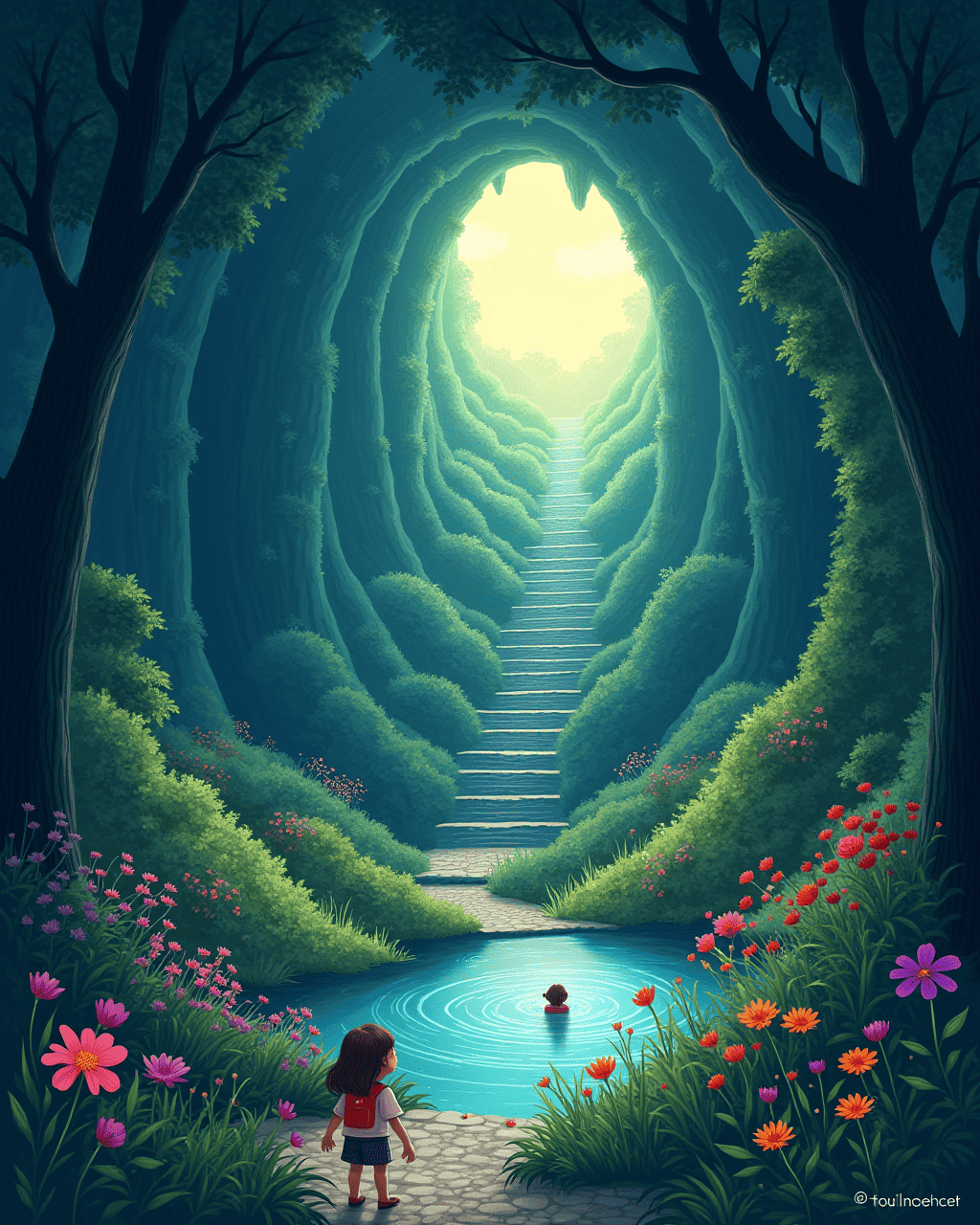 At the bottom of the staircase, they found the heart of the maze: a vast cavern lit by bioluminescent fungi and a glittering lake that mirrored the stars. Inside the lake, a gentle spirit appeared, thanking them for unlocking the maze's secret path. With the spirit's gift of a moonstone, the friends climbed back up through the hidden staircase and emerged at the garden's gate at dawn. As the first rays of sunlight touched their faces, the garden faded, revealing the ordinary town of Willowbrook. Back in the attic, they laid the silver map beneath a new layer of dust, knowing that the moonlit maze would be waiting for their next adventure.