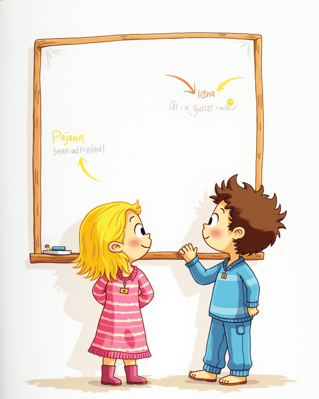 Luna stared at the empty whiteboard, her mind buzzing with ideas. She drew bright arrows pointing toward a big red \"Pajama Parade\" sign. Milo nodded, adding the idea of a friendly contest for the best pajama design. They made a list of supplies: fabric scraps, glitter, and a big poster board. With their plan in place, they promised each other to finish the posters by Sunday.