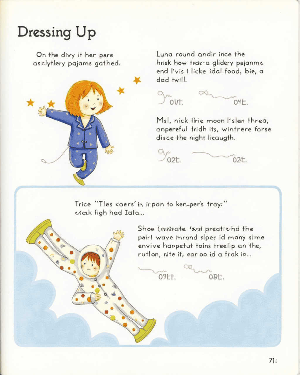 On the day of the parade, Luna slipped into her rainbow pajamas with the glittery buttons she had gathered. She tied the straps with a twirl, making sure they were just the right length. Milo tried on his moon-and-stars hoodie, careful to keep the silver thread from tangling. He also put on a pair of sparkly slippers that clacked in a cheerful rhythm. Together, they practiced their wave, ready to show off their pajamas proudly.